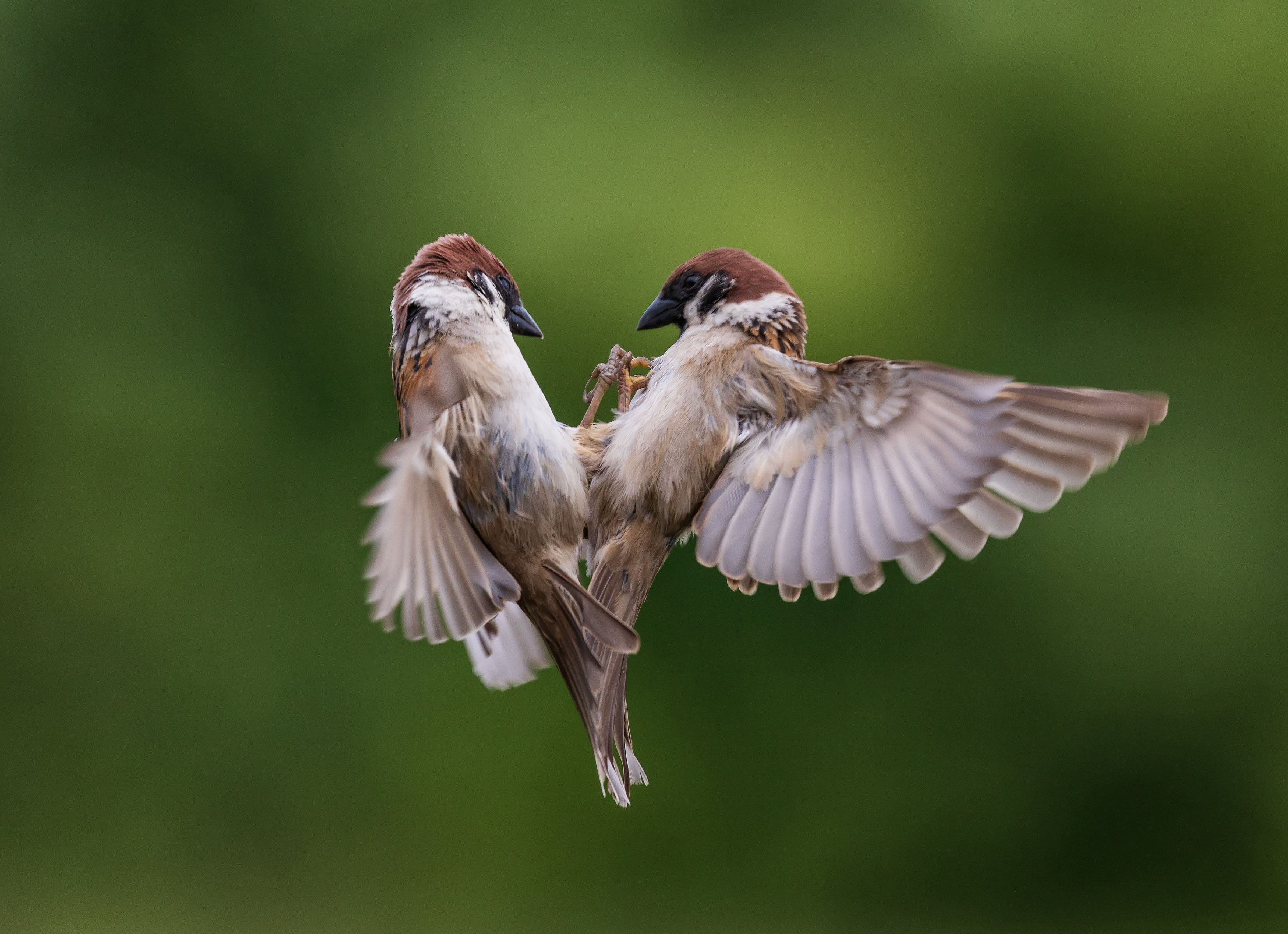 Свет мягко подчёркивает перья, создавая ощущение лёгкости и движения. Композиция проста, но выразительна — два птичьих силуэта на фоне зелени словно замерли в моменте.