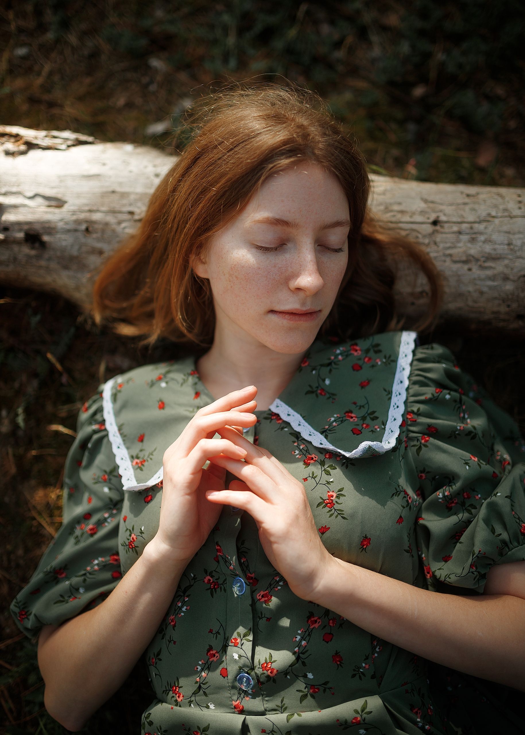Екатерина, в этом кадре — тишина, но не пустота: как будто время замедлилось, и девушка просто *есть*, в лесу, в свете, с закрытыми глазами — будто слушает что-то, что не слышно ушами. Свет ложится на шею, руки, ткань — и всё это выглядит естественно, будто снимок вырос из момента, а не построен.