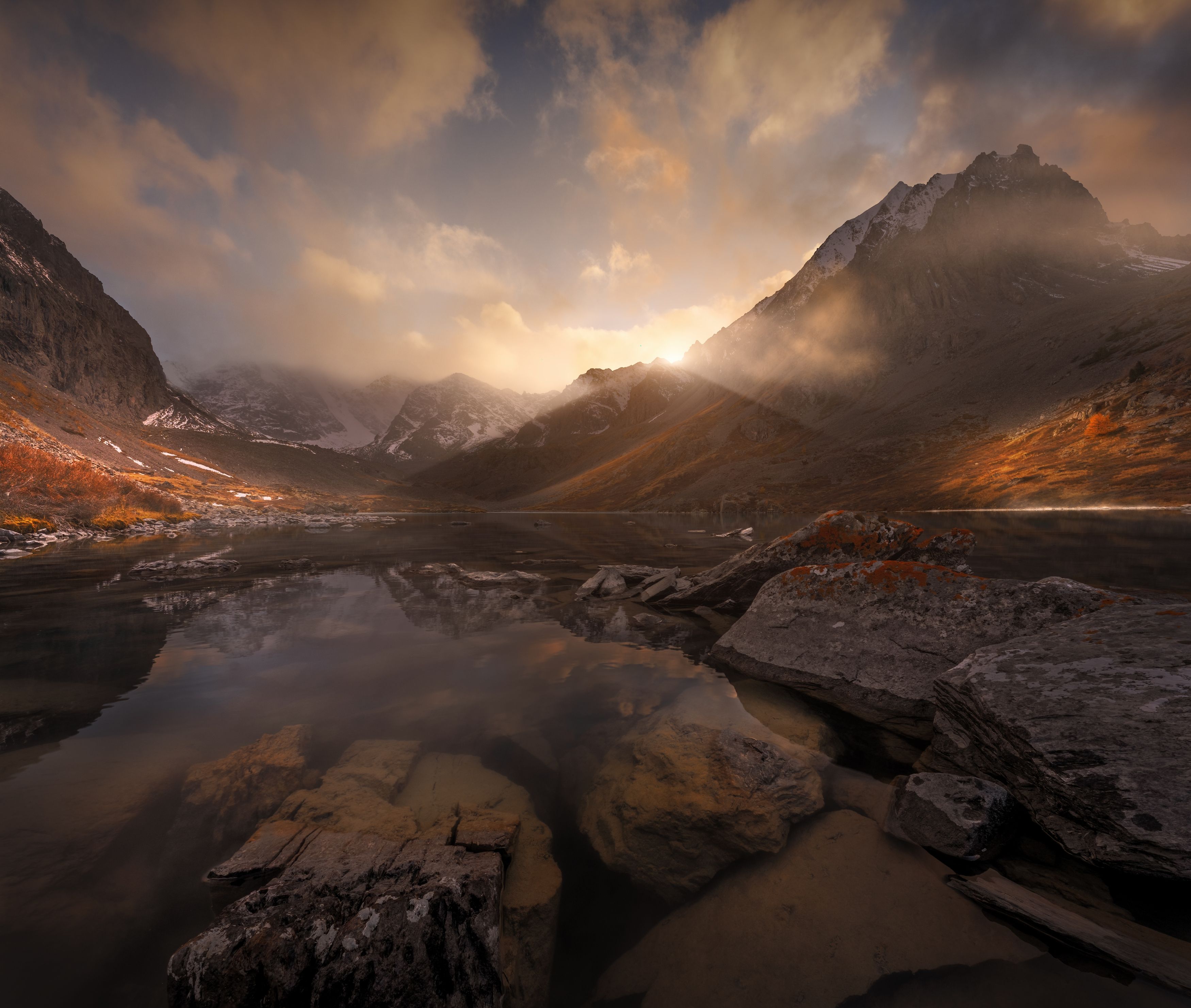 Александр, снимок мощный — как будто солнце только что прорвалось сквозь тучи и зажгло горы. Видно, что вы успели в самый момент. Какие были условия? Видно, что вода почти как зеркало — было утро, и совсем тихо? И как вы снимали — с какого угла, и долго ли ждали этого света?