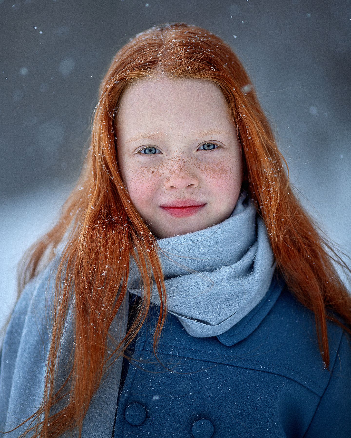 На снимке — портрет девочки с яркими рыжими волосами и нежным выражением лица, стоящей в снегу. Синее пальто и светлый шарф контрастируют с холодным фоном, подчеркивая её живость. Падающие снежинки создают атмосферу тишины и чистоты. Фотография передаёт внутреннюю светлую энергию ребёнка — «живую душу» в зимнем пейзаже. Работа Солнечного Александра.