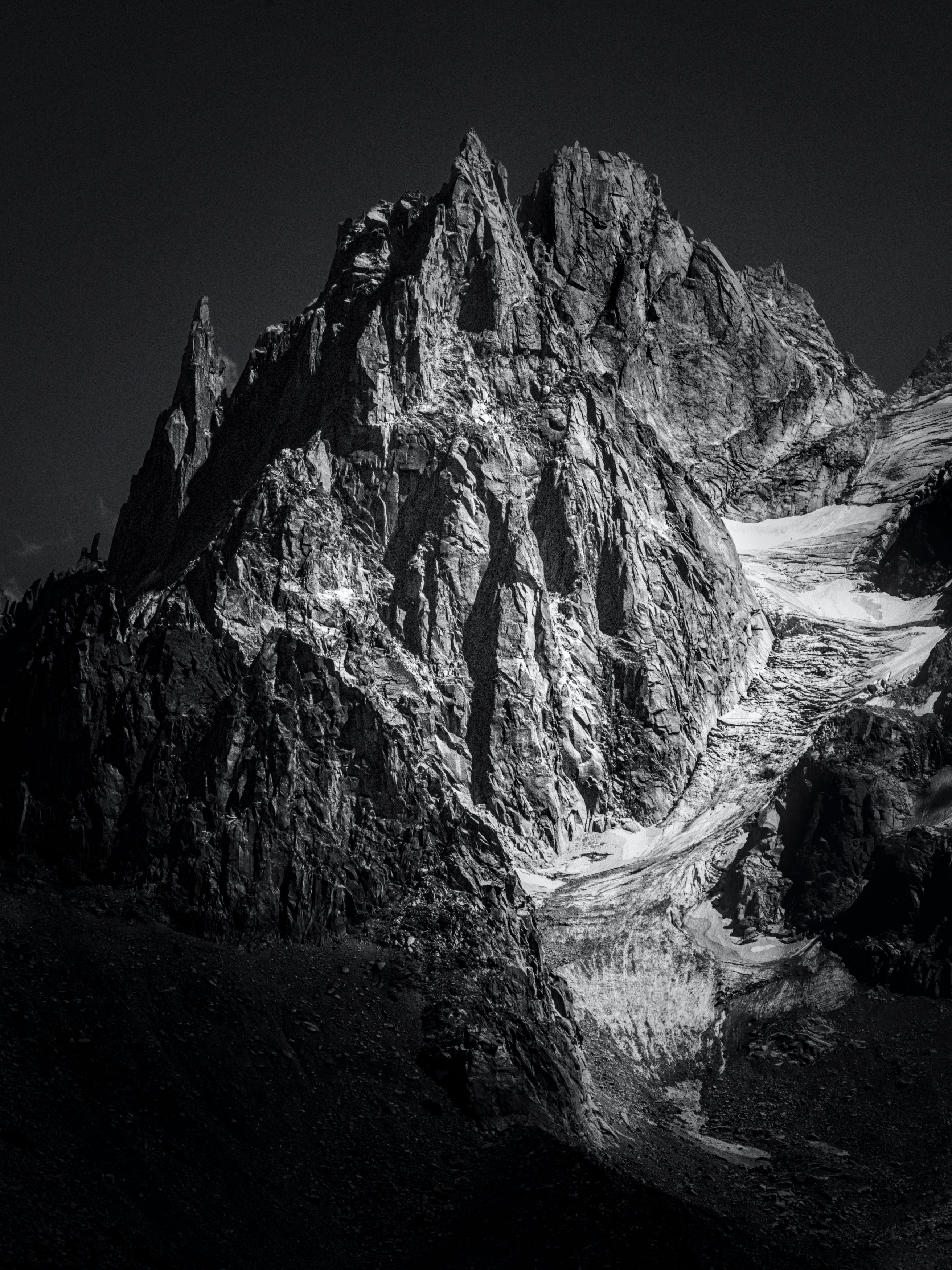 Strong contrast, clean lines. The way the light hits the rock face gives it a sharp, almost sculpted look. The snow patch adds a quiet curve to the otherwise jagged shape.
