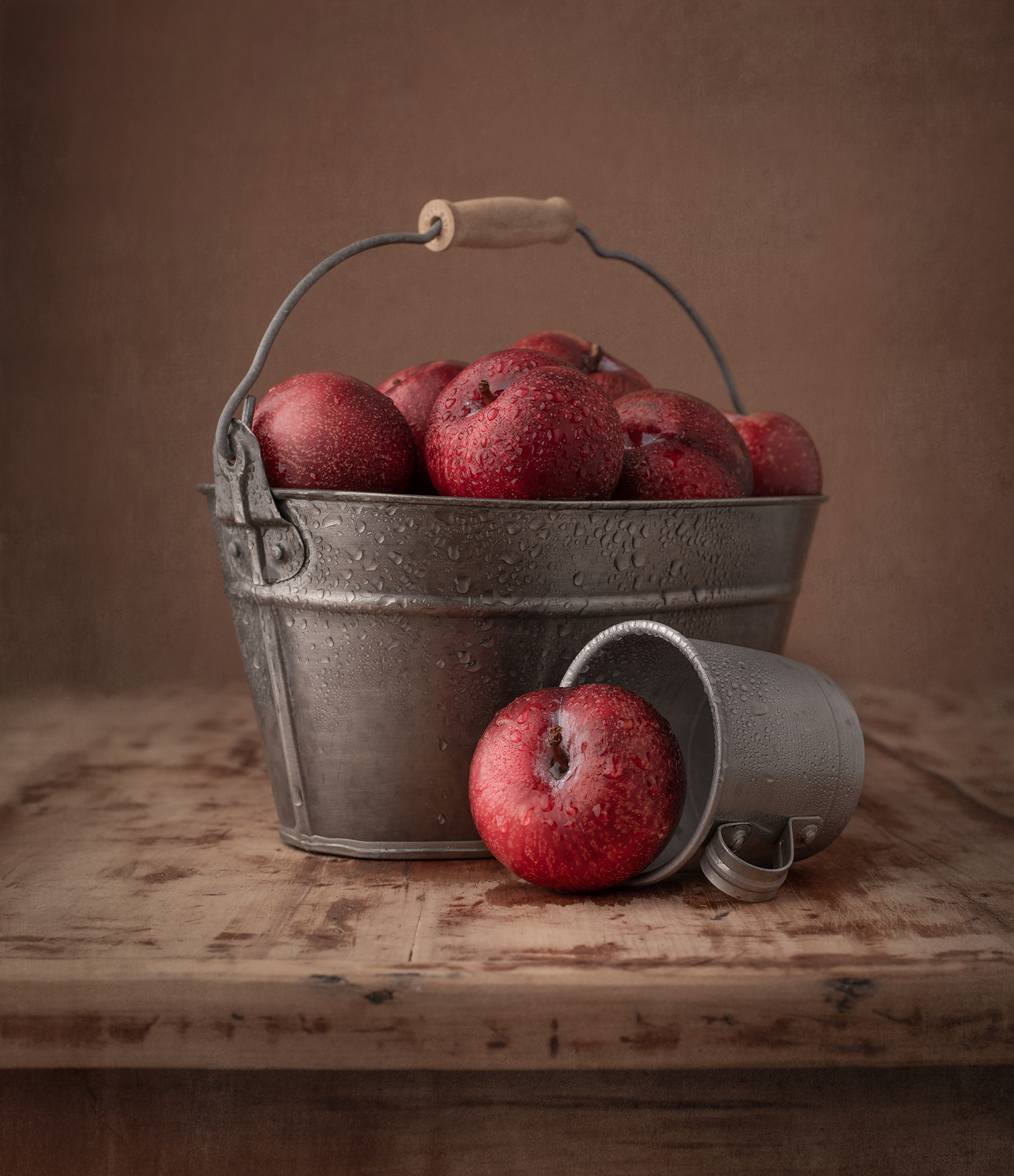 The plums are rich in color, with a deep red that stands out against the muted tones of the metal bucket and wooden surface. The water droplets add texture and a sense of freshness. The lighting is soft and even, highlighting the roundness of the fruit without harsh shadows. The composition is balanced — the fallen cup and single plum in front create a natural, unforced rhythm. The textures of the metal, wood, and skin of the plums are well rendered. Overall, it’s a quiet, grounded still life that feels honest and tactile.