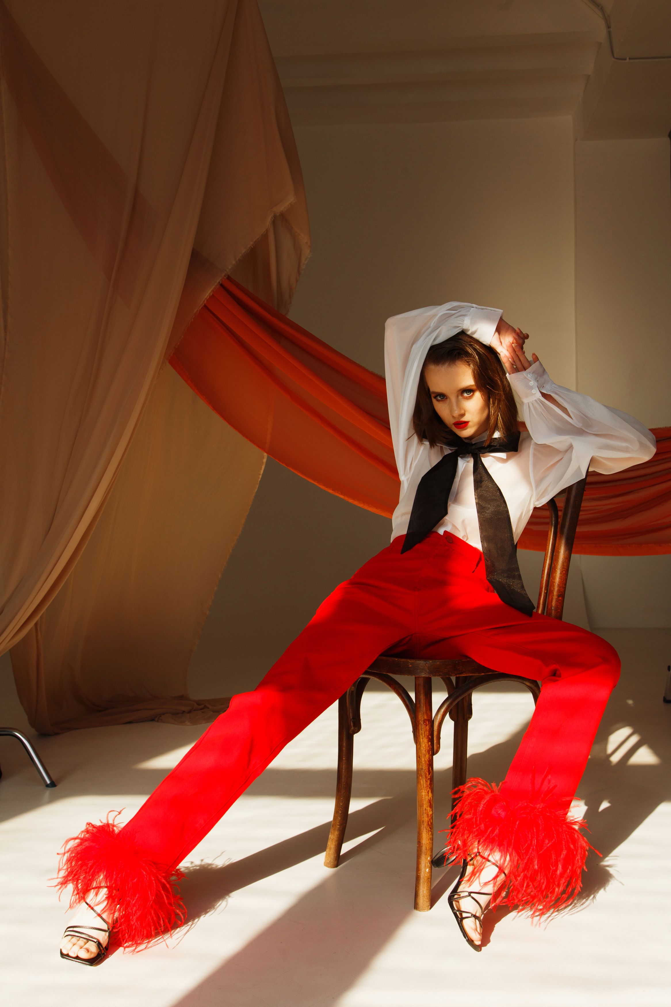 Круто снято — свет, цвета, поза. Красные штаны с перьями — бомба. Стильный образ, сильный взгляд.