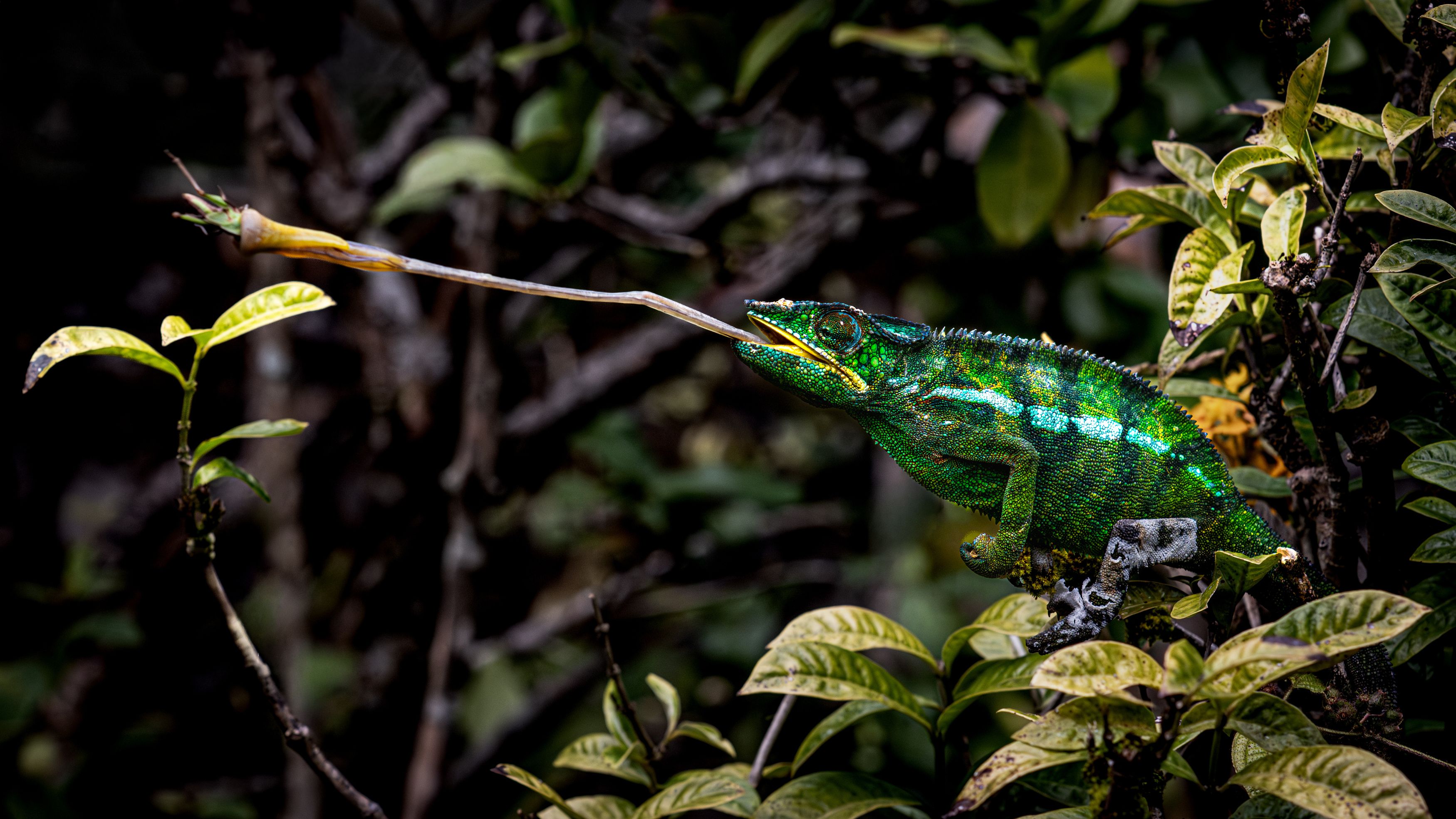 Хамелеон в долю мгновения превращается в живую катапульту: его язык буквально выстреливает из пасти, разгоняясь примерно до 100 км/ч всего за сотые доли секунды, чтобы захватить добычу, сидящую на соседнем листе. Мощные эластичные ткани у основания языка работают как натянутая рогатка, поэтому язык может пролететь расстояние, сопоставимое или даже большее длины тела самого хамелеона, а ускорение при старте больше, чем у многих суперкаров при разгоне. Всё, что видит жертва, — это зеленая тень в листве и «выстрел» липкого биологического гарпуна, который за какие‑то 0,007–0,07 секунды тянет её обратно прямо в пасть хищника.