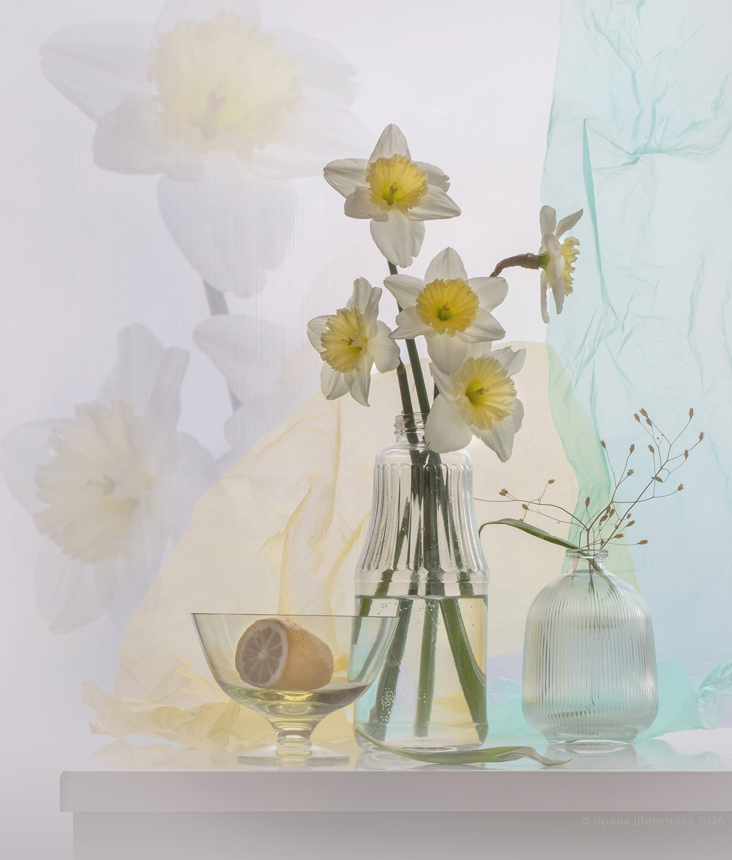 Ирина, как Вы решили настроить цветовую палитру — сознательно выбрали эти оттенки, чтобы подчеркнуть нежность нарциссов, или они сложились естественно? 🌼