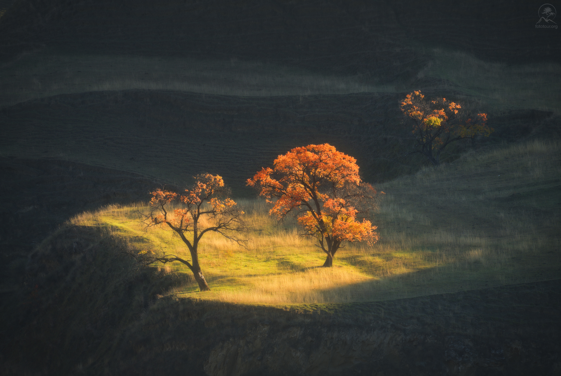 Снимок передаёт тонкую игру света и тени на дагестанских склонах. Три дерева в лучах осеннего солнца — как акценты на фоне глубоких тонов ландшафта. Композиция выстроена с чувством меры, в ней — и динамика, и умиротворение. Вы, Анатолий, умело выделили детали, не перегружая кадр.