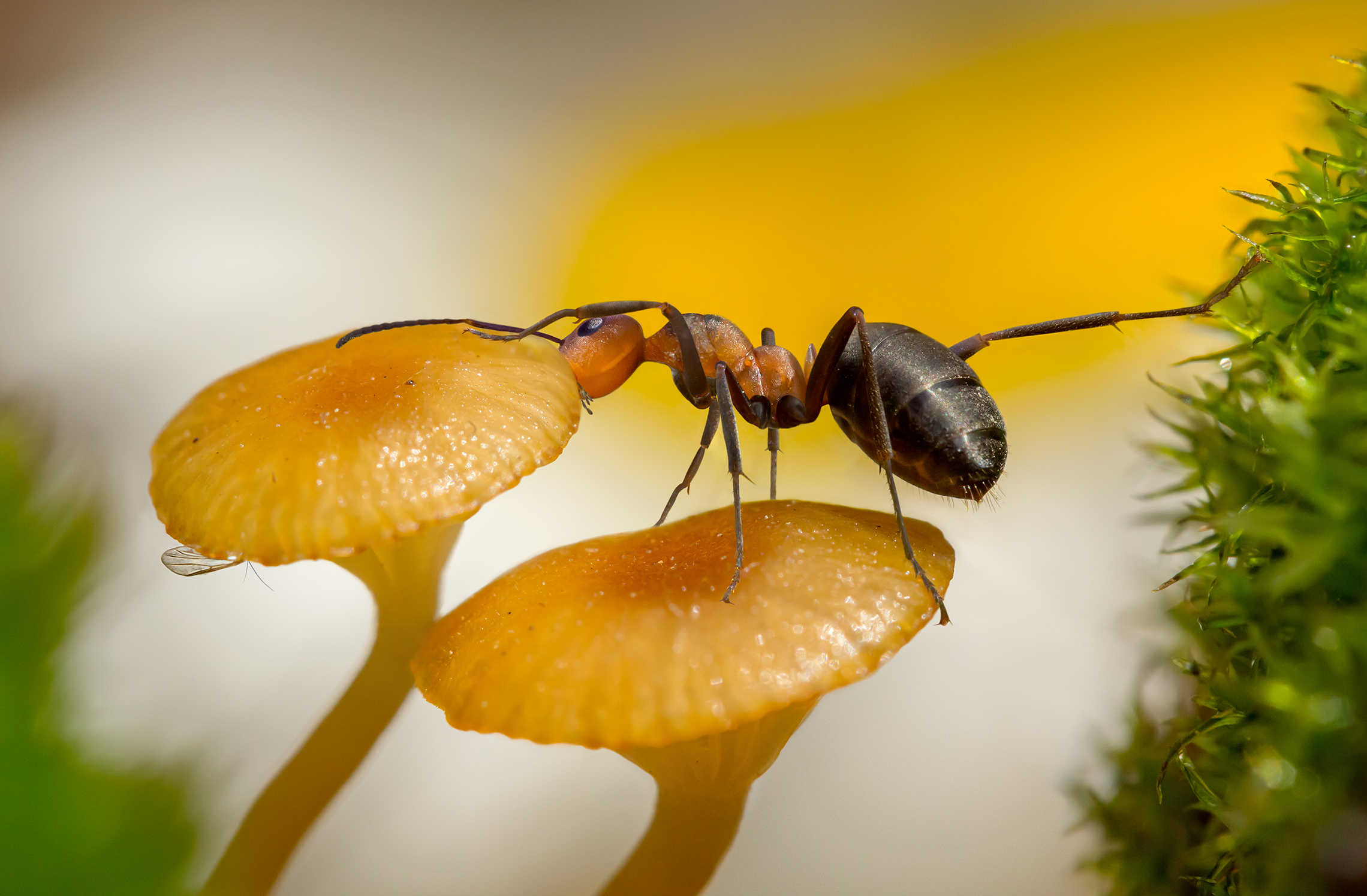 Вы снова поймали момент, когда природа становится сказкой — муравей на грибочке, словно в поисках чего-то скрытого, и вдруг — тля под шляпкой. Такая сцена кажется почти театральной, но при этом столь естественной. Свет мягко обволакивает, акцентируя каждую деталь, будто приглашая заглянуть в этот маленький мир.