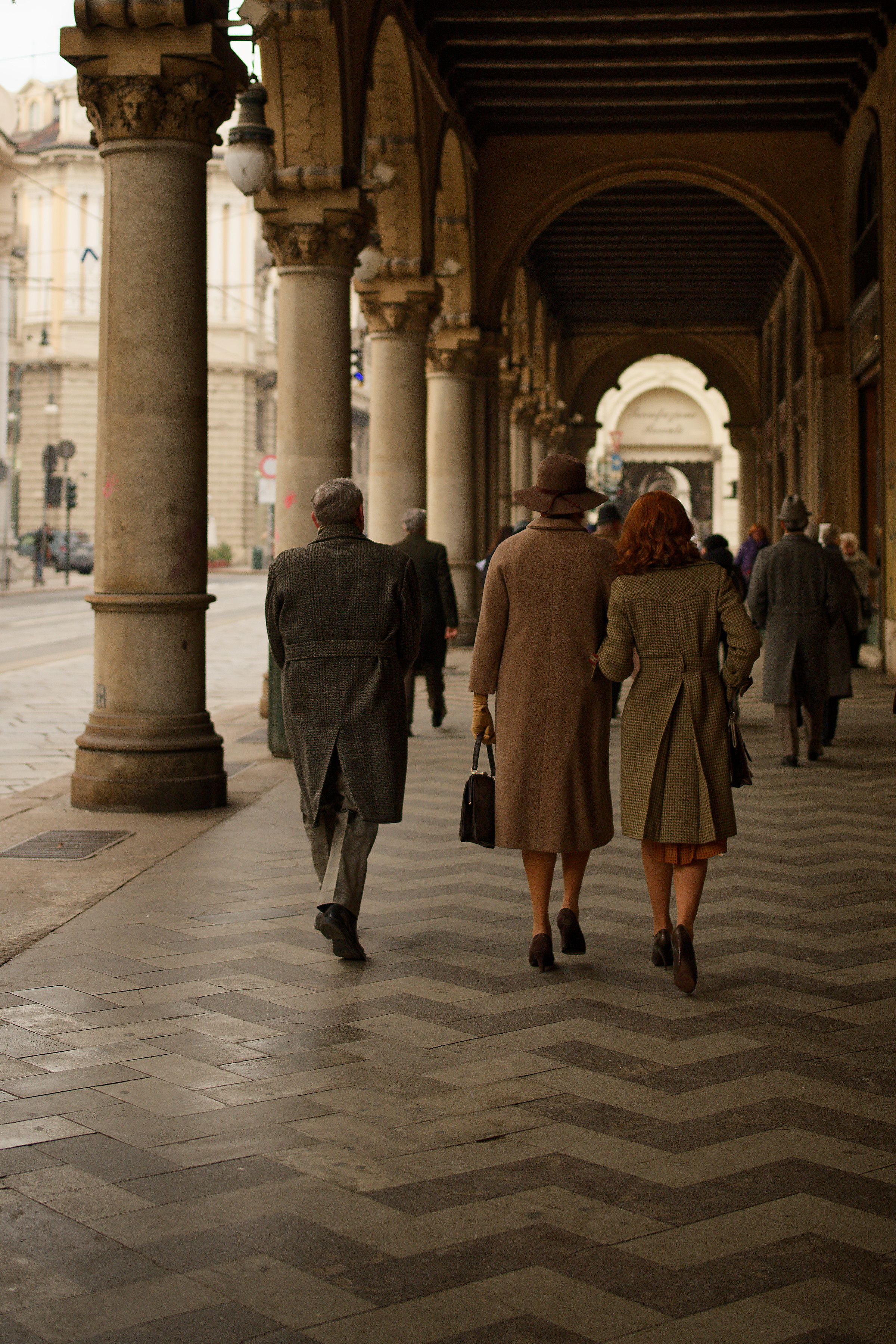 Снимок передаёт атмосферу урбанистической классики — аркады, колонны, узорчатый брусчатый пол, фигуры в пальто и шляпах. Композиция строится на линиях перспективы, которые ведут взгляд вглубь улицы, создавая ощущение движения и глубины. Освещение мягкое, тёплое, подчёркивает текстуру камня и тканей.