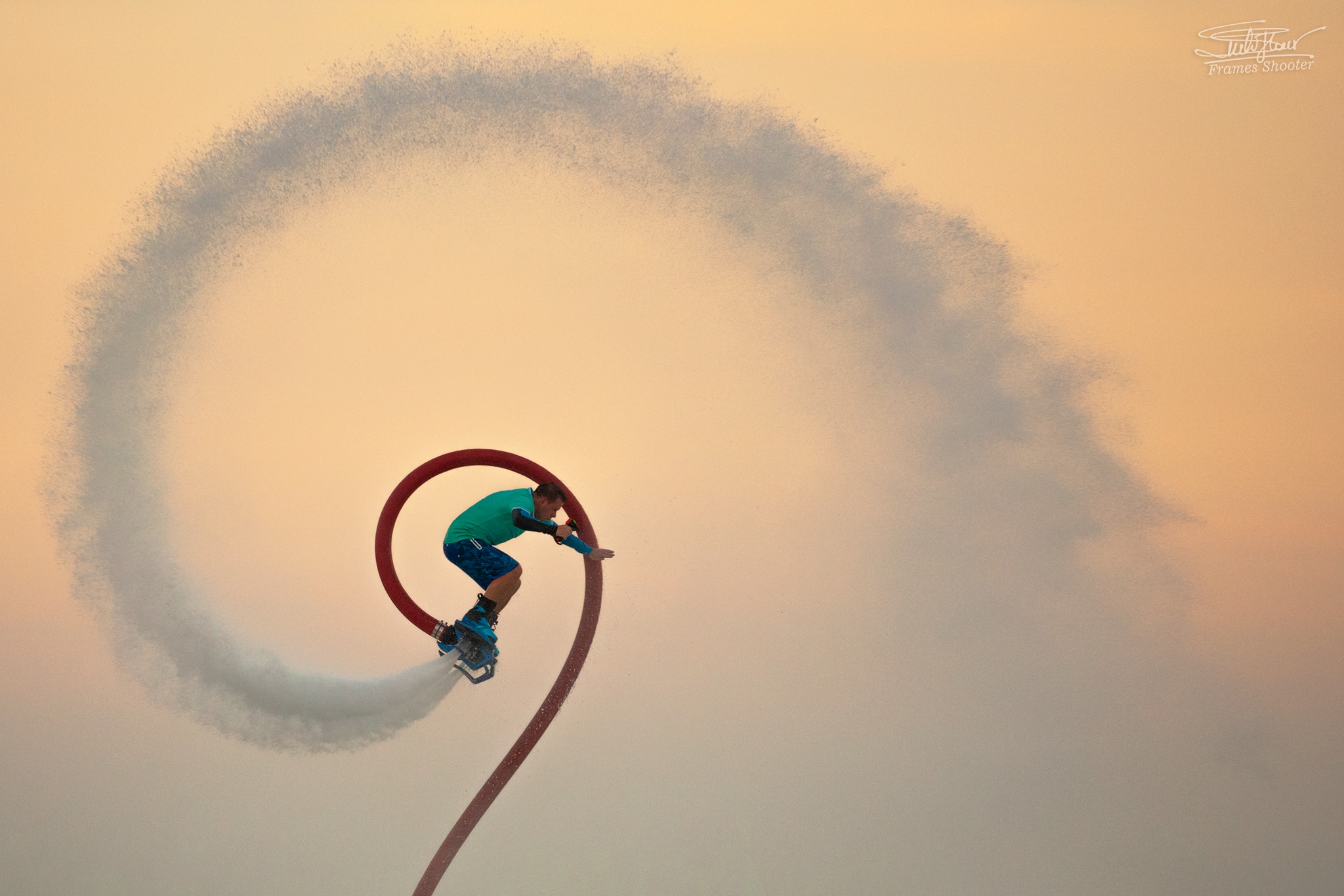 Strong composition — the spiral of spray and the rider’s arc echo the golden ratio in a clean, dynamic way. The warm light and tight framing make it feel both precise and alive.