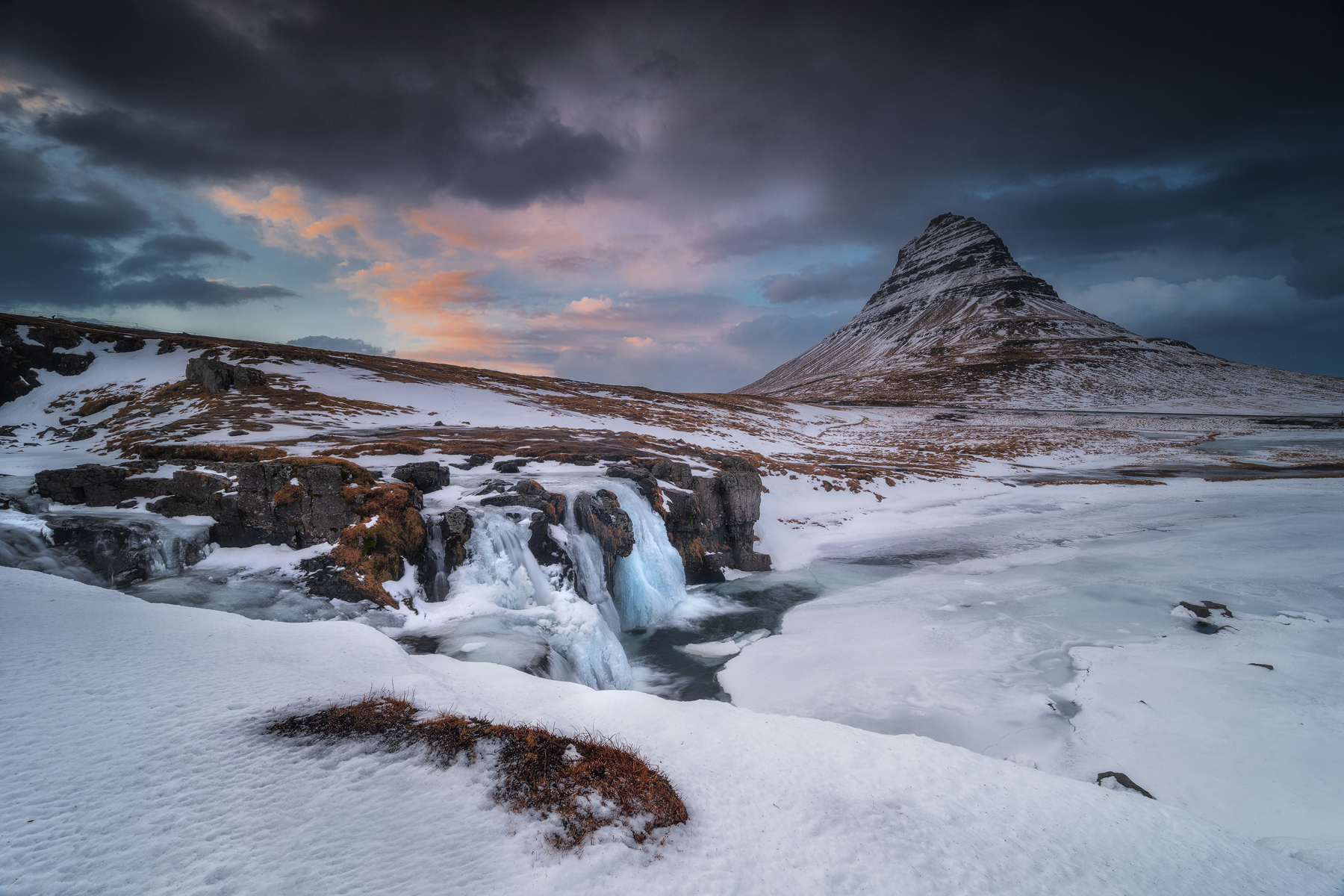 На снимке — суровая красота исландской природы: снежные равнины, ледяной водопад и вулканическая вершина Бардсфелл на фоне бурного неба. Момент застывшего времени, когда вода замерзает, а свет заката пронизывает тучи. Фотография передаёт одновременно холод и живую силу природы. Снимок отражает вечную борьбу элементов — льда и воды, тьмы и света.