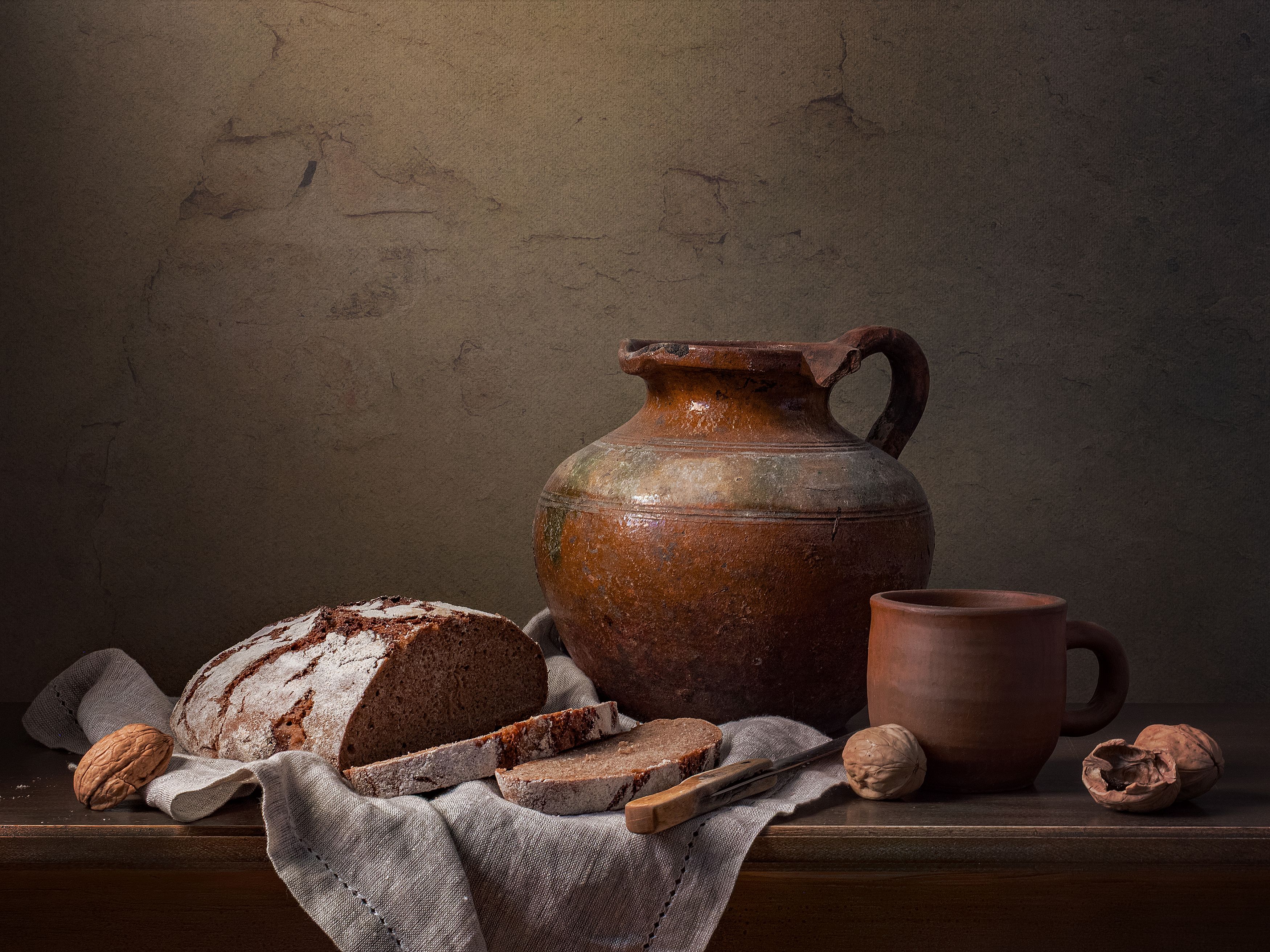 Валерий, снимок — как старинный дневник, который не спешит раскрываться. Свет здесь тёплый, почти чувствуется, как он ложится на глину и хлеб — это уже знакомо, вы ведь часто играете с такими тонами.