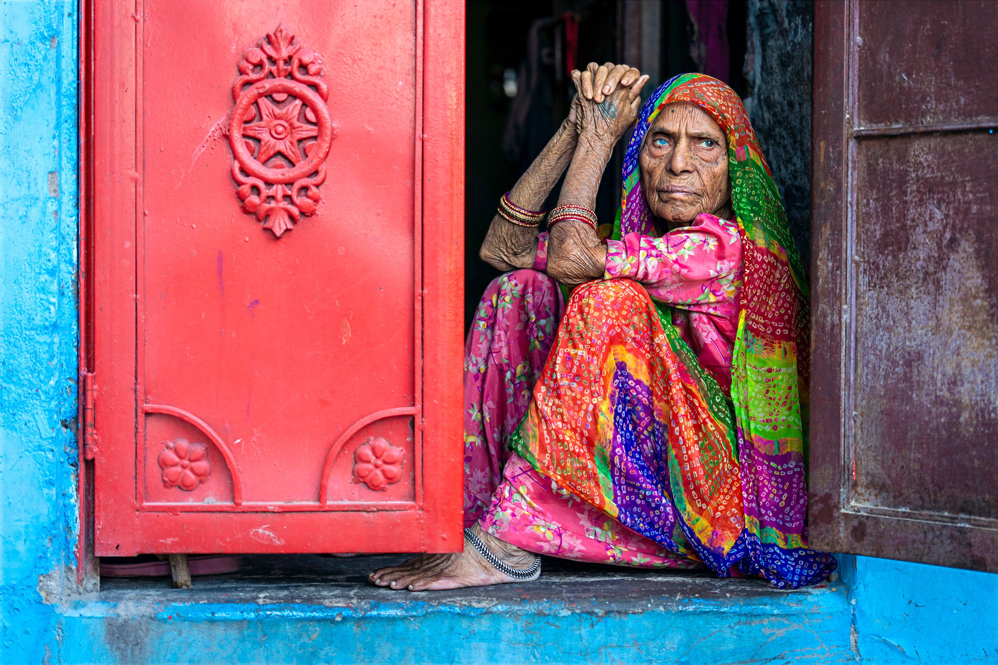While getting lost in the labyrinthine streets of the Blue City (Jodhpur), I felt time stand still at the threshold of this red door. The depth in her eyes and the nobility of her posture drew me in like a magnet as she silently watched the flow of the street. While her colorful attire reflected the energy of Rajasthan, the static wisdom in her gaze seemed to hold a thousand untold stories.