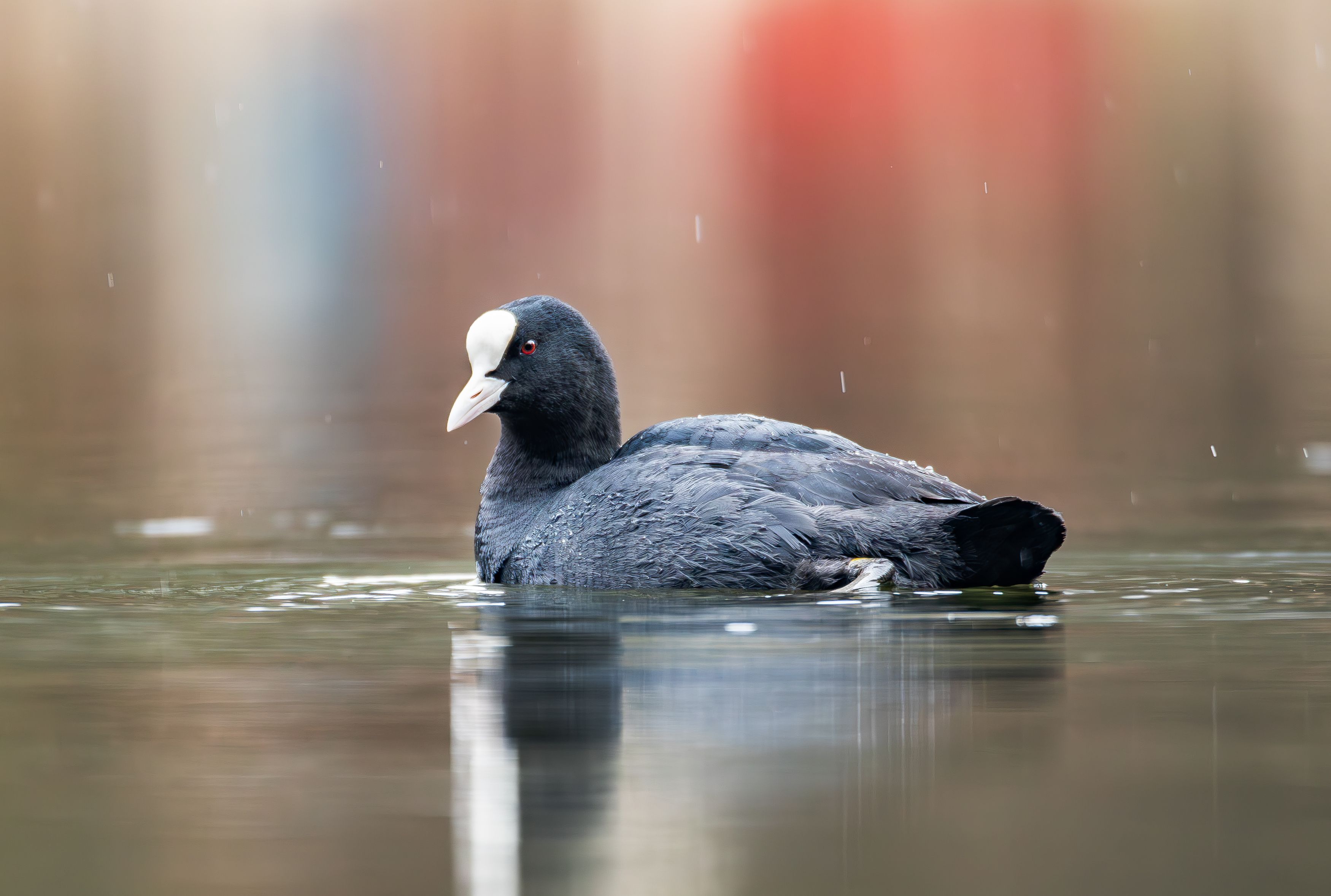 Хотелось бы уточнить — это был снимок в дождь? Видно, что капли падают на воду, и птица, кажется, не обращает внимания. Или это просто эффект от размытого фона? А ещё — как удалось так мягко выделить птицу на фоне? Кажется, вы хорошо проработали глубину резкости.
