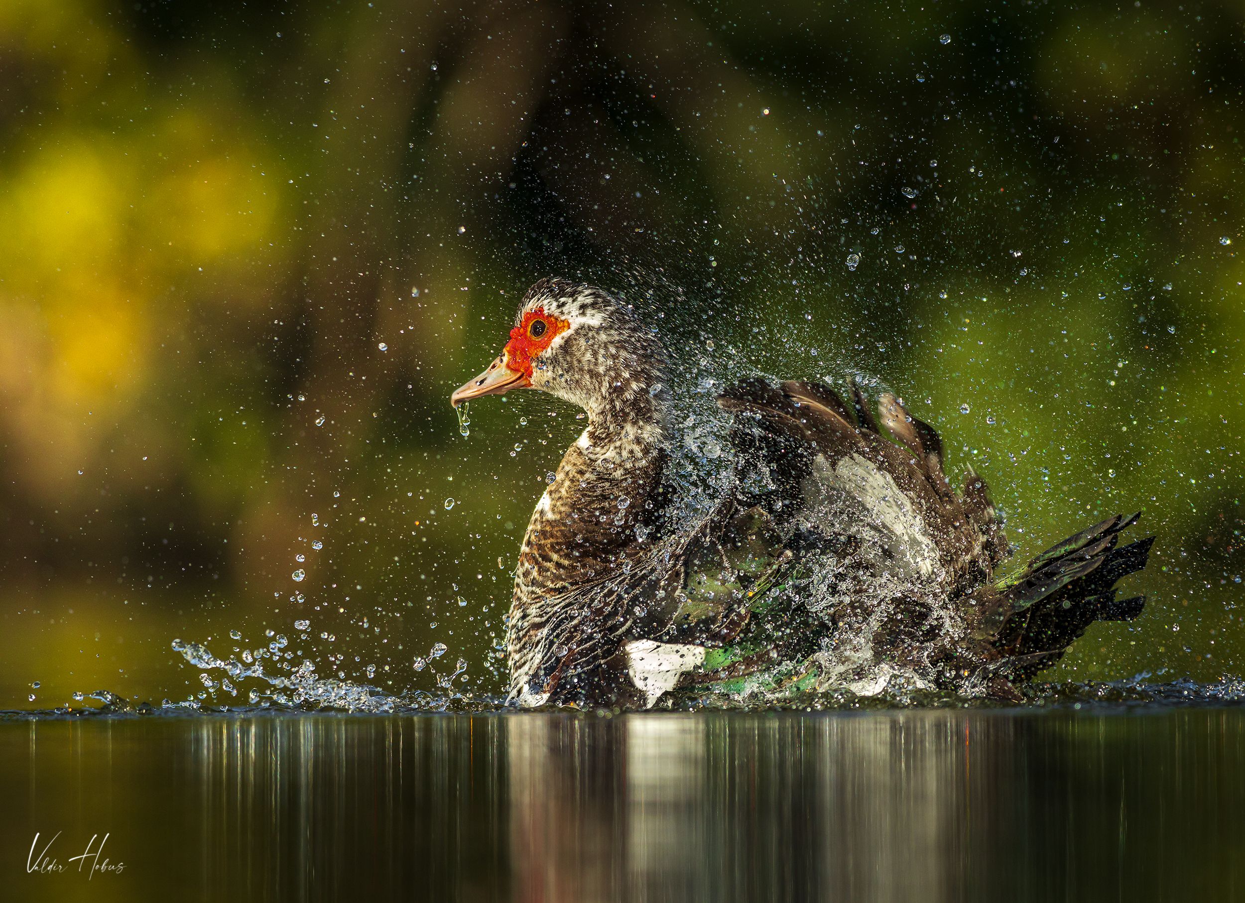 Sharp focus on the duck mid-splash, with water droplets frozen in motion. The red eye and beak stand out cleanly against the soft, green bokeh. Reflections add depth without distraction. Clean, dynamic, well-timed. 🦆
