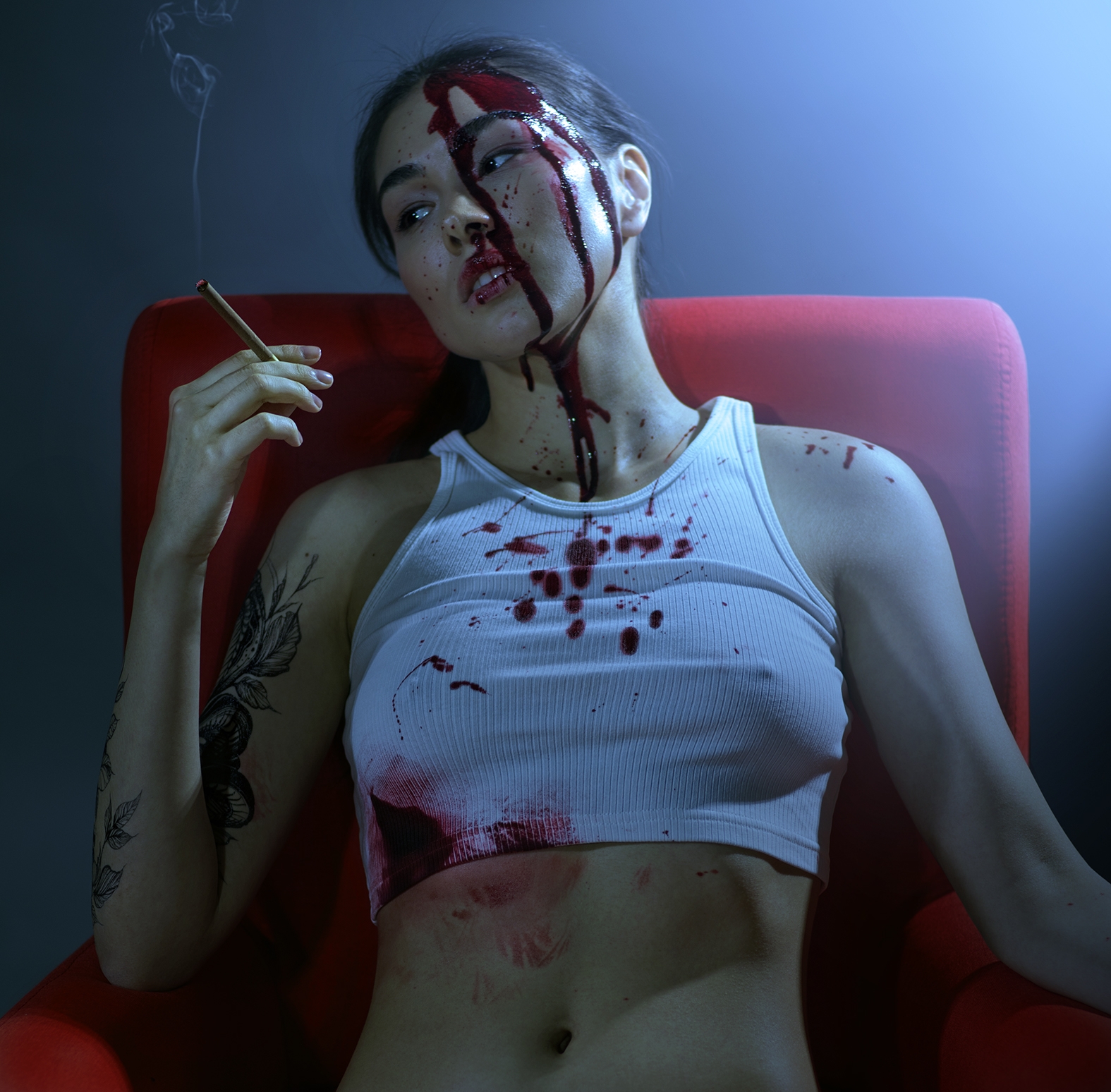 Сильные стороны: выразительный образ, сильный контраст красного и тёмного фона, драматичная игра света и тени, естественное положение модели, детализированный макияж крови и татуировка — всё это создаёт мощную атмосферу. 🌪️