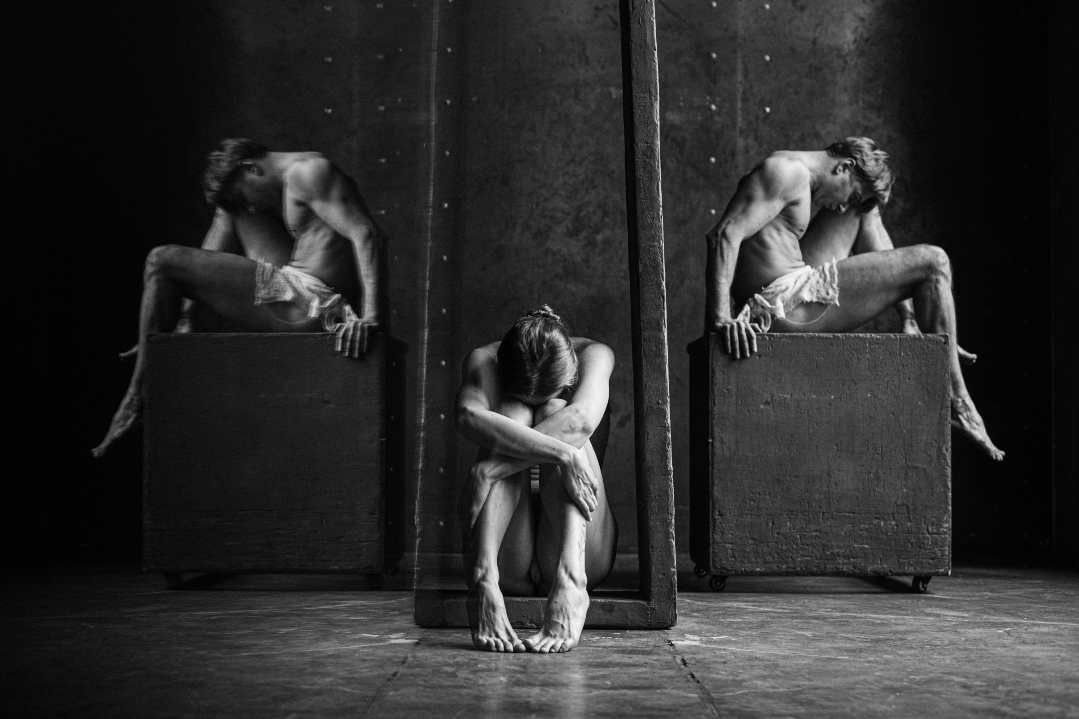 На снимке Мариной Щегловой запечатлены три фигуры, погруженные в мрачную, почти театральную атмосферу. Каждая — в своей изоляции, в позах, выражающих боль, смирение и внутреннюю борьбу. Свет и тень играют роль драматургов, подчеркивая контуры тел и усиливая ощущение безысходности. Это не просто портреты — это метафора человеческих страданий, снятая с глубоким психологическим напряжением. Фотография вызывает размышления о внутреннем мире, о том, как мы прячем свои боли и боремся с собой в тишине.
