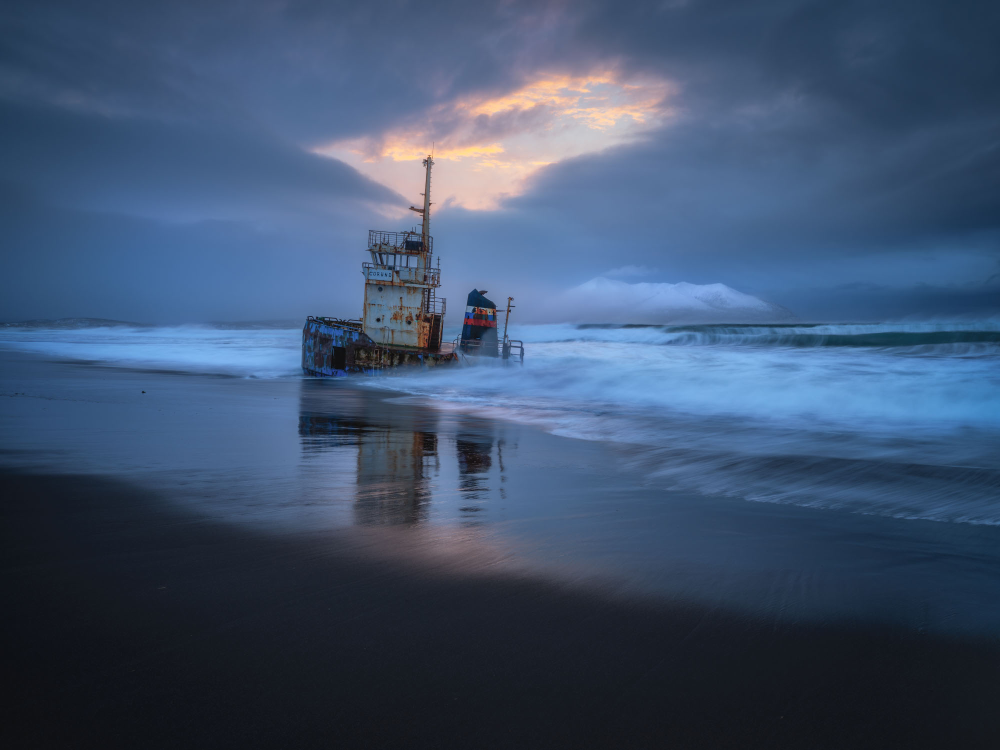 Буксир “Corund”, выброшенный на мель в тихоокеанском заливе Итурупа в 2015 году, уже давно стал местной достопримечательностью. Можно сказать, что он дальневосточный брат судна, севшего на мель в Териберке (чем-то они похожи, да и пляжи и тут и там песчаные).
