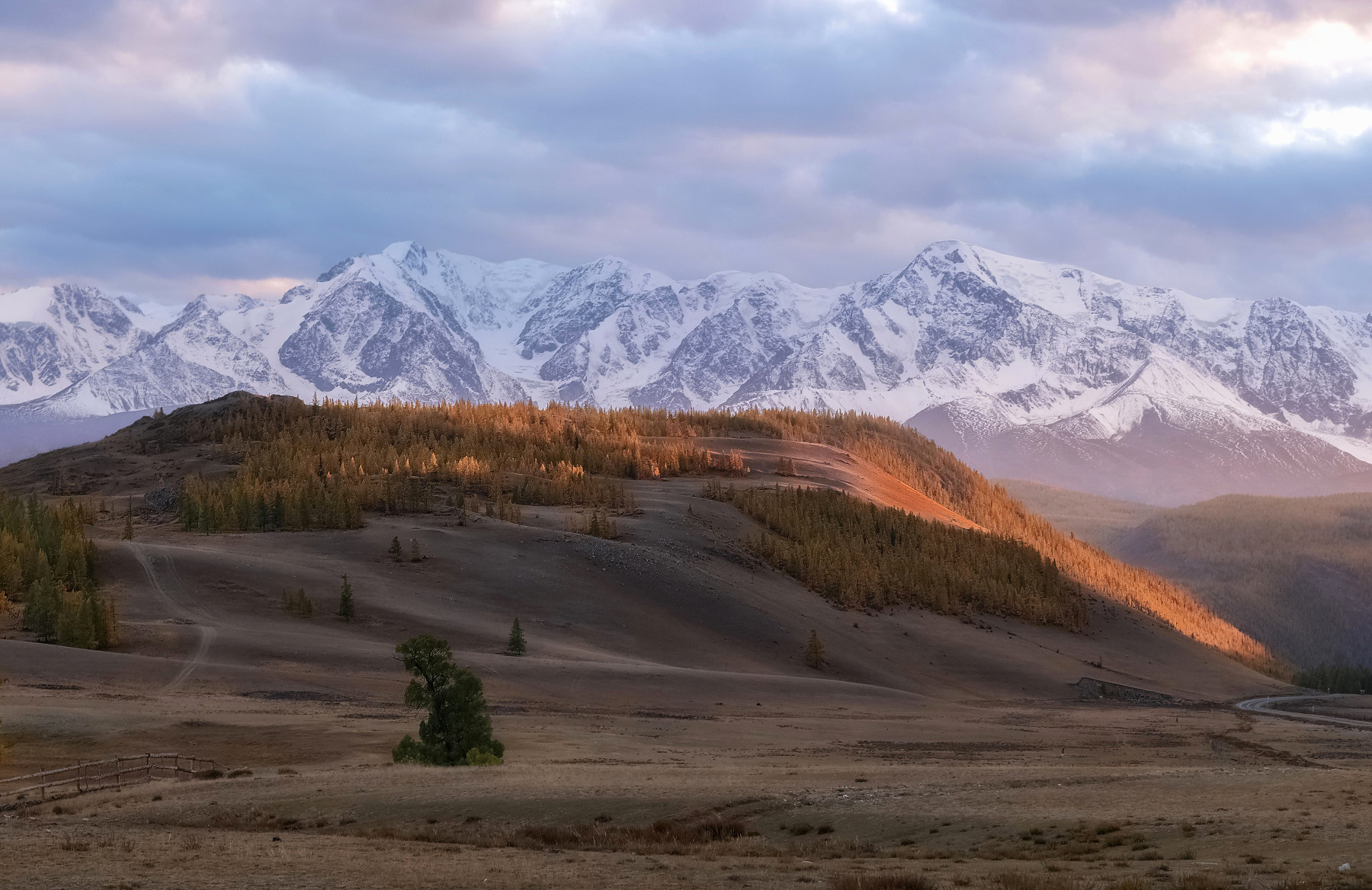 На фотографии запечатлён живописный вид на Северный Чуйский хребет в вечернее время. Последние лучи заходящего солнца освещают холмистый передний план, придавая ландшафту золотистое свечение. На фоне возвышаются величественные снежные вершины под облачным небом. Работа Марии Фоминой передаёт атмосферу умиротворения и красоты алтайской природы в сумерках.