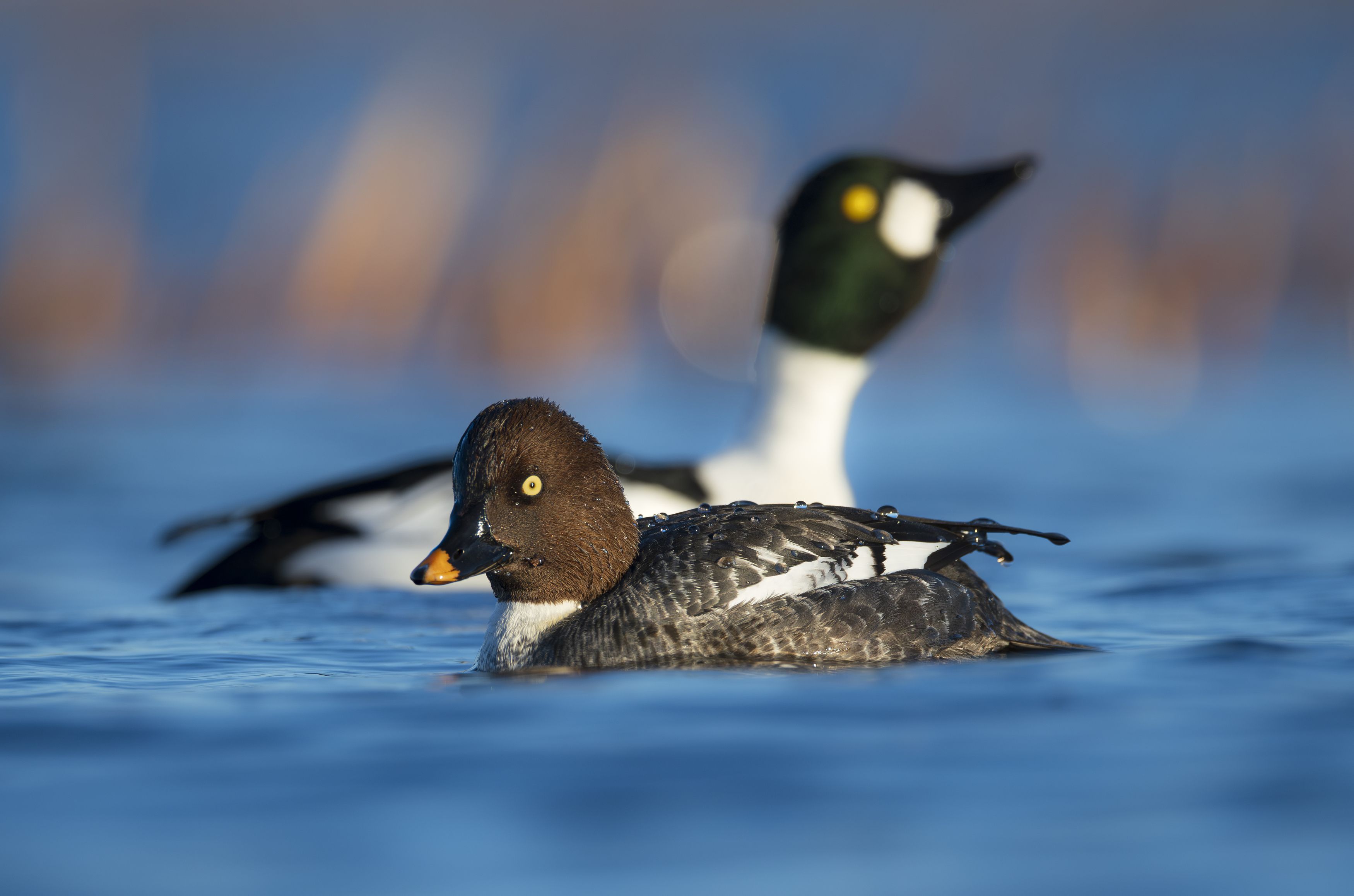 ервые числа апреля, воздух на заливе пока прохладный — остатки ледового покрова ещё встречаются на поверхности, да и вода всего +1°C! Солнышко пригревает и кружит голову не только людям (Homo sapiens ?), но и всему живому вокруг. Вот, например, утка-гоголь в это время преображается в актёра. Например, голова у самца в этот период начинает переливаться ярко-изумрудным цветом (в обычное время года она чёрная). А это, как-никак, сигнал для самок о силе и здоровье самца! А чего стоит их танец! Это самый знаменитый элемент их тока: селезень закидывает голову на спину, клювом вверх, после чего резко выбрасывает её вперёд. В этот момент он громко вскрикивает и бьёт лапками по воде. Смотрится это так, будто он прочитал книгу \\\"100 способов впечатлить даму\\\" и решил выполнить несколько упражнений за 5 секунд. ? // It\\\'s early April, and the air in the bay is still cool—remnants of ice still linger on the surface, and the water is only 1°C! The sun warms and intoxicates not only humans (Homo sapiens ?) but also all living things around them. For example, the goldeneye duck transforms into an actor at this time. The male\\\'s head begins to shimmer a bright emerald green during this period (it\\\'s normally black). This, after all, is a signal to the females about the male\\\'s strength and health! And their dance is worth a look! This is the most famous part of their mating display: the drake throws his head back, beak up, and then suddenly throws it forward. At this moment, he screams loudly and slaps his feet in the water. It looks as if he\\\'s read the book \\\"100 Ways to Impress a Lady\\\" and decided to perform several exercises in 5 seconds.