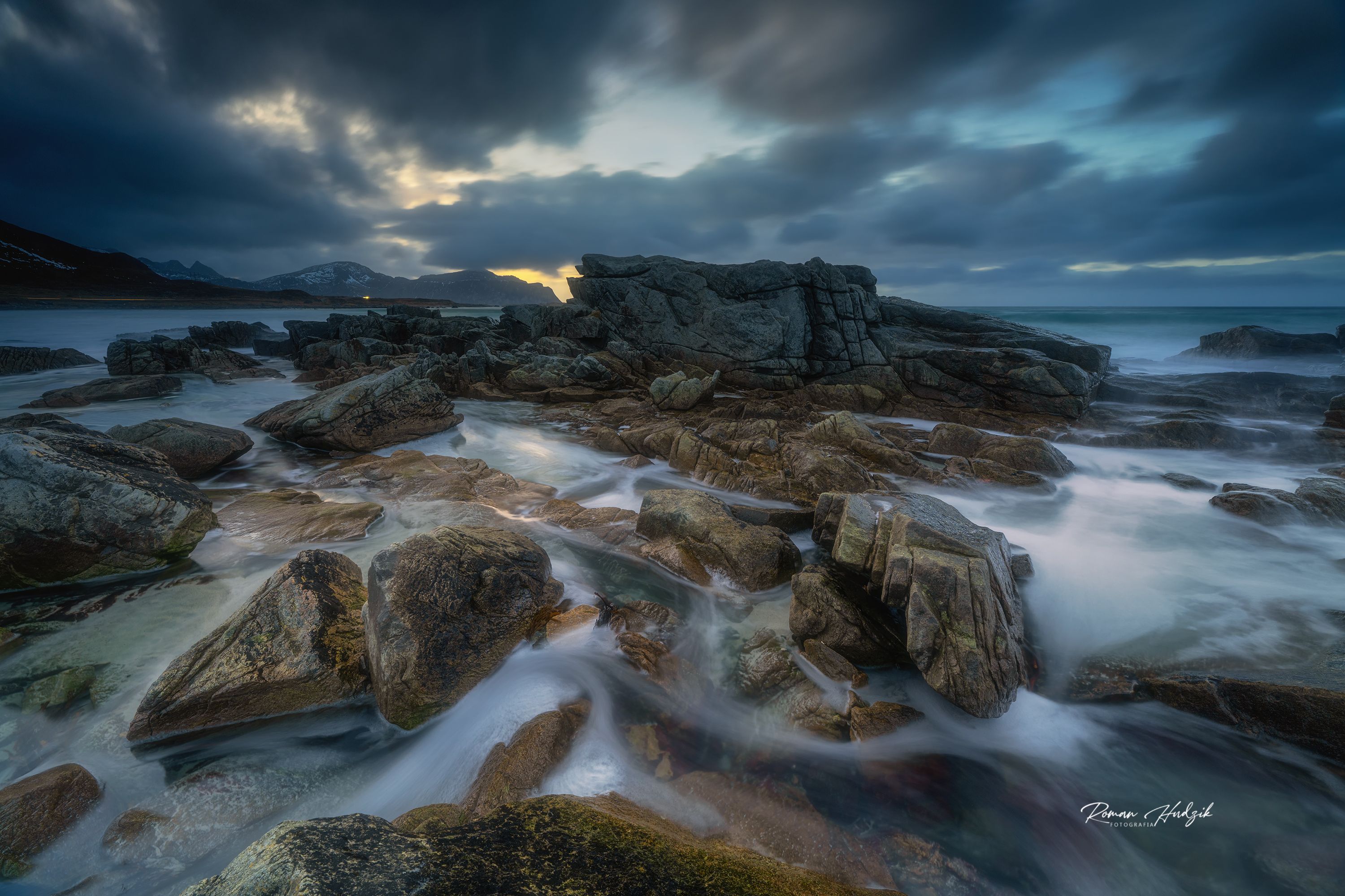 The long exposure really works here. The water looks soft around those rocks instead of choppy. You kept the detail in the clouds while still getting that glow from behind. It feels grounded and steady.