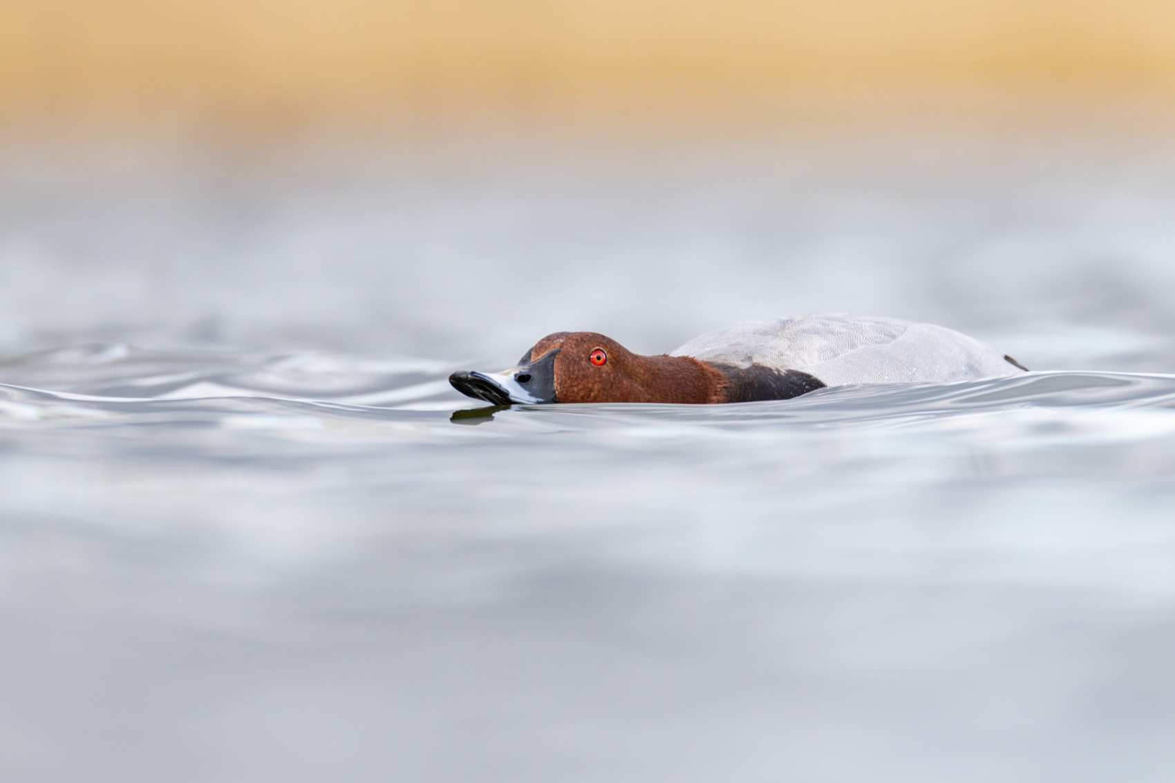 Красивый момент: рыжеголовый нырок плавно скользит по воде, будто исполняет свой тихий брачный танец. Отличная детализация и мягкий фон — всё работает на атмосферу.