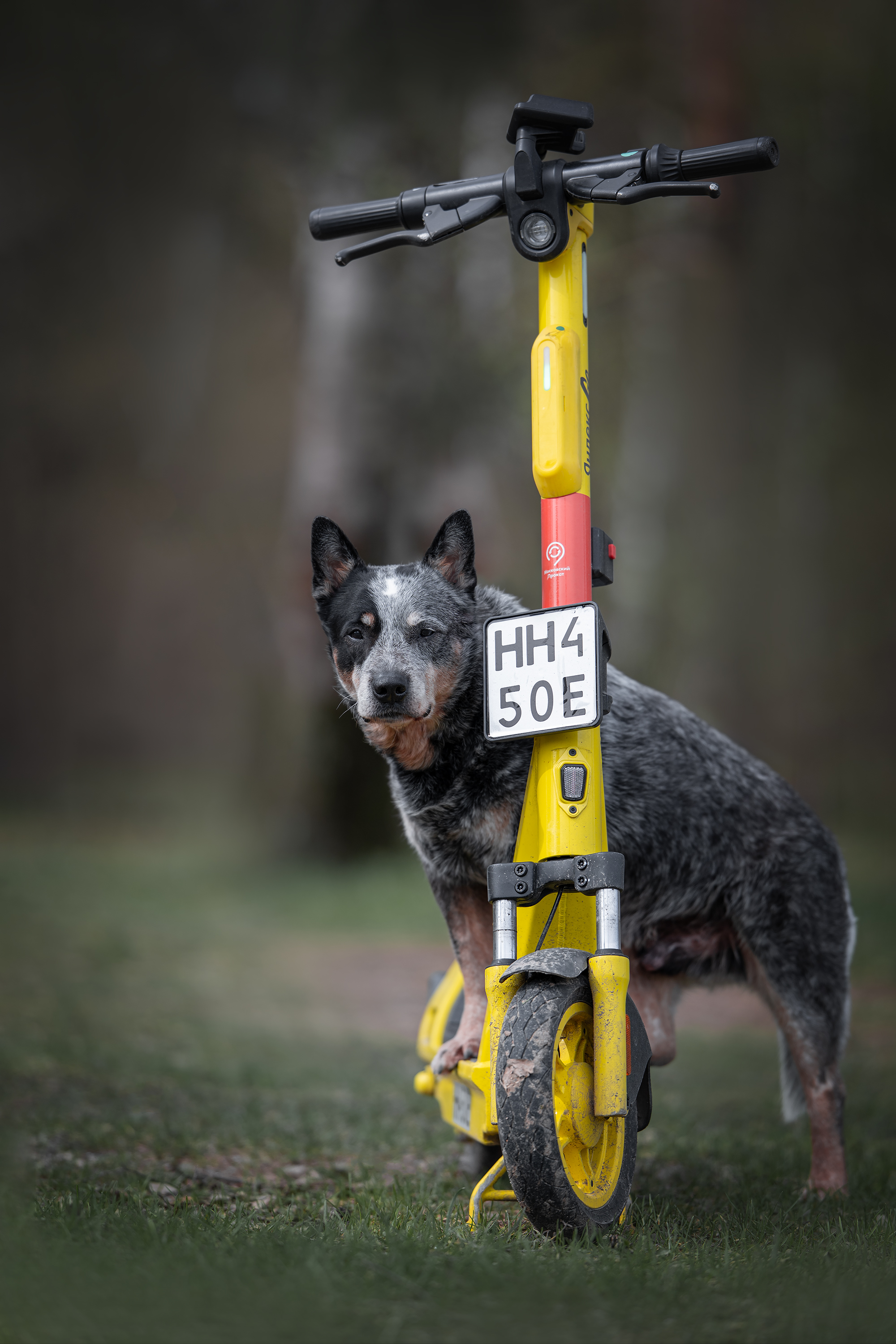 На снимке — австралийский хилер, стоящий рядом с ярко-жёлтой электрической самокатом в парковой зоне. Размытый фон подчёркивает тему городского транспорта и экологичного передвижения. Сцена передаёт ощущение лёгкости, независимости и готовности к новому сезону — как для человека, так и для его питомца.