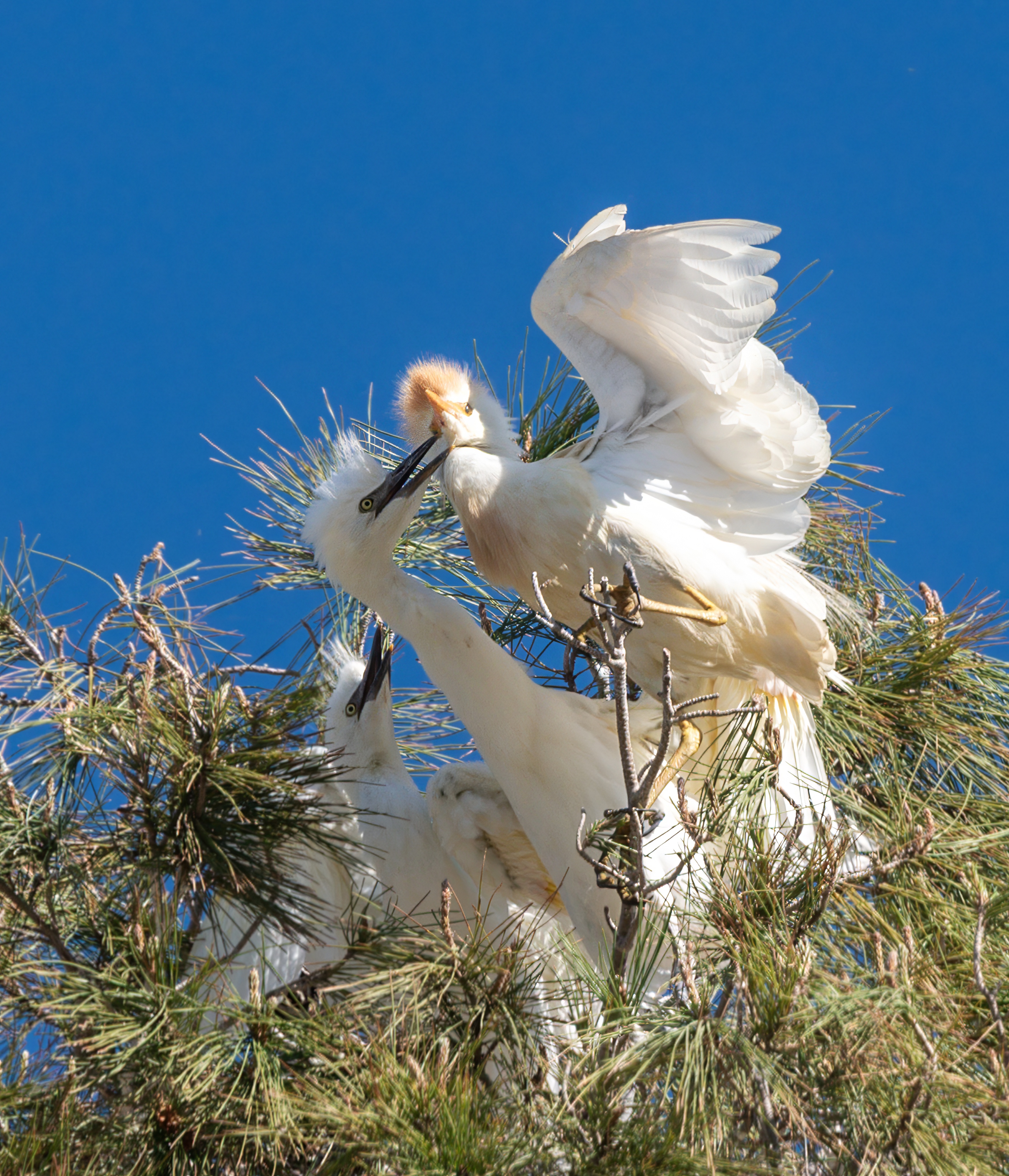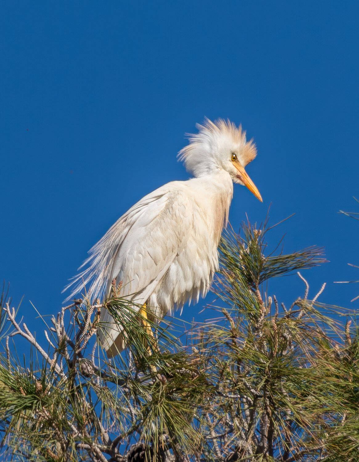 У египетской цапли в брачный период на голове, шее и груди вырастают охристо-оранжевые или рыжеватые перья, образующие характерный взлохмаченный хохолок. Так и ходят всю весну.