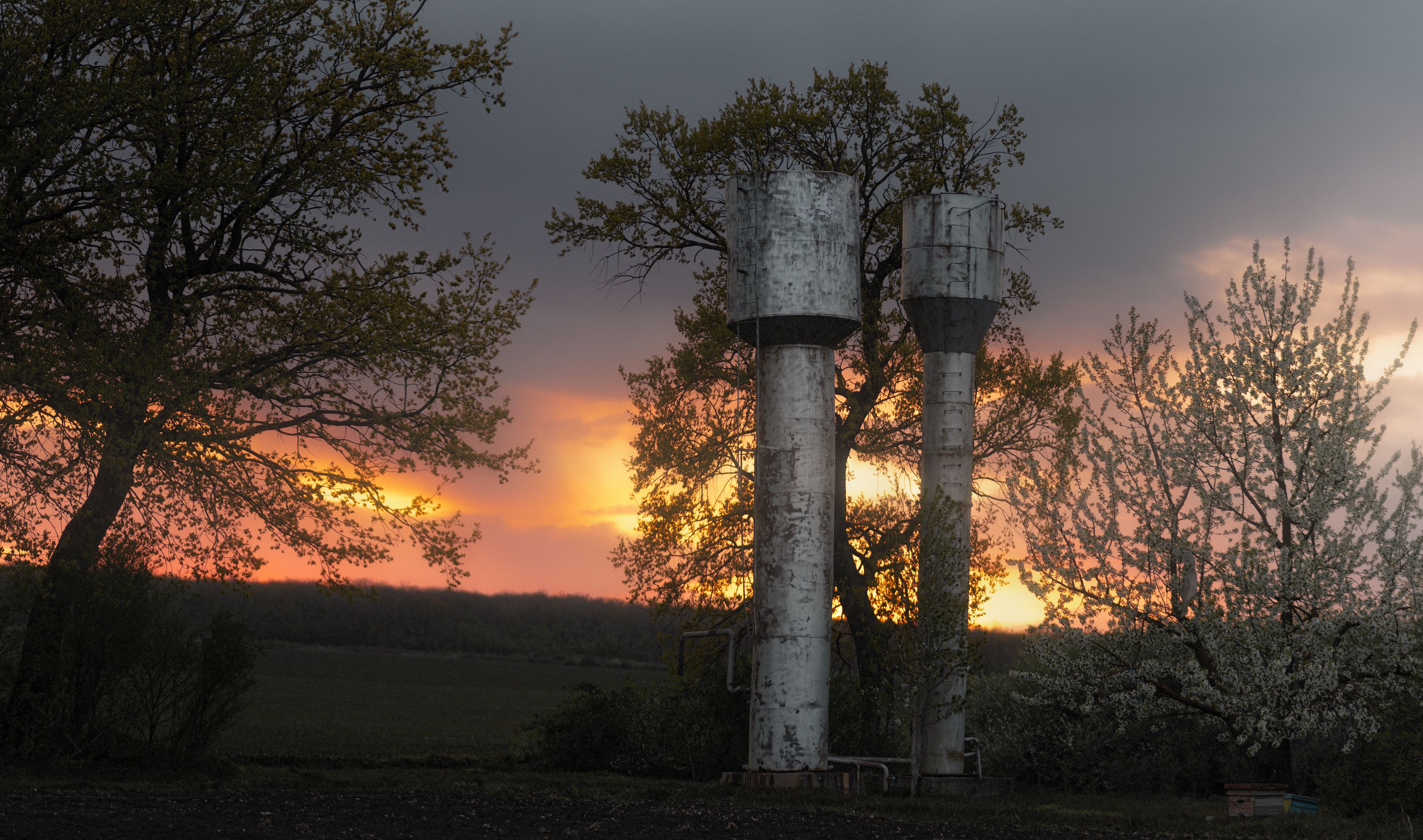 Две башни, словно старые стражи, застыли на границе дня и ночи. В их холодном металле отражается пламя уходящего солнца, а рядом робко цветет весна. Это тихий диалог между индустриальным прошлым и вечным циклом природы, где даже ржавая сталь кажется частью великого заката