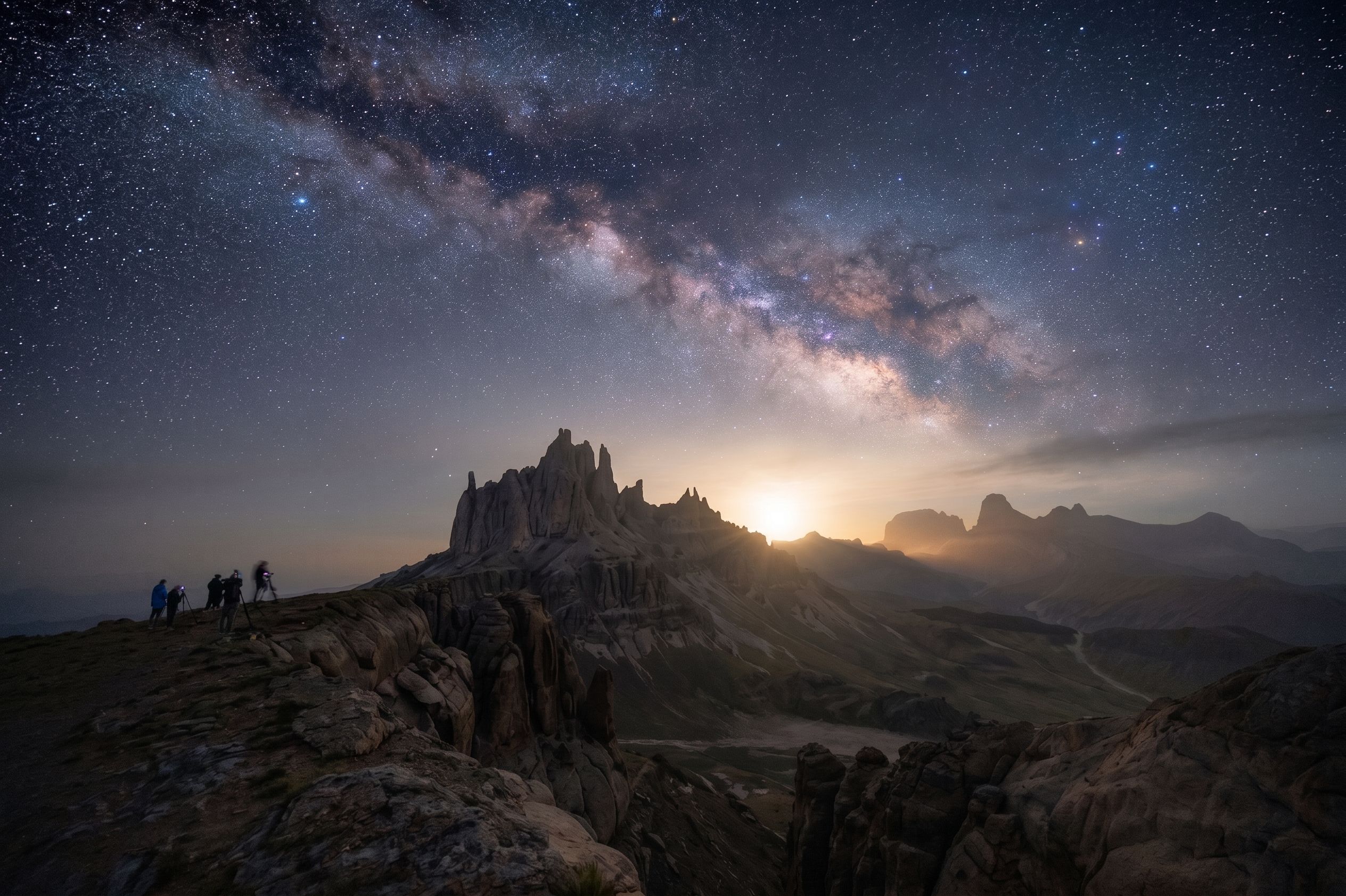 Сначала я воочию увидел Млечный Путь. Не на картинке, не в кино, а над своей головой — такой огромный, что, казалось, сейчас упадёт на эти скалы и рассыплется звёздной пылью прямо мне в объектив. Потом начался восход луны из-за горы — медленный, торжественный, как выход главного героя на сцену. И всё это — вперемешку с туманом, который то приползал, укутывая долину, то уползал, открывая новые планы. Сказка. И немного безумие.