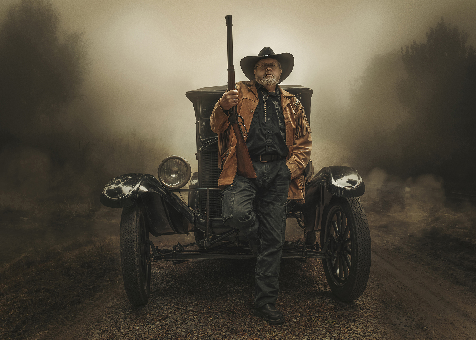 The sepia tone gives this a solid editorial feel. It’s an interesting mix of Western attire with an early 20th-century car, though the styling feels slightly modern in its execution. The lighting is soft and flattering for the subject. Did you use a haze machine to create that atmospheric fog effect?
