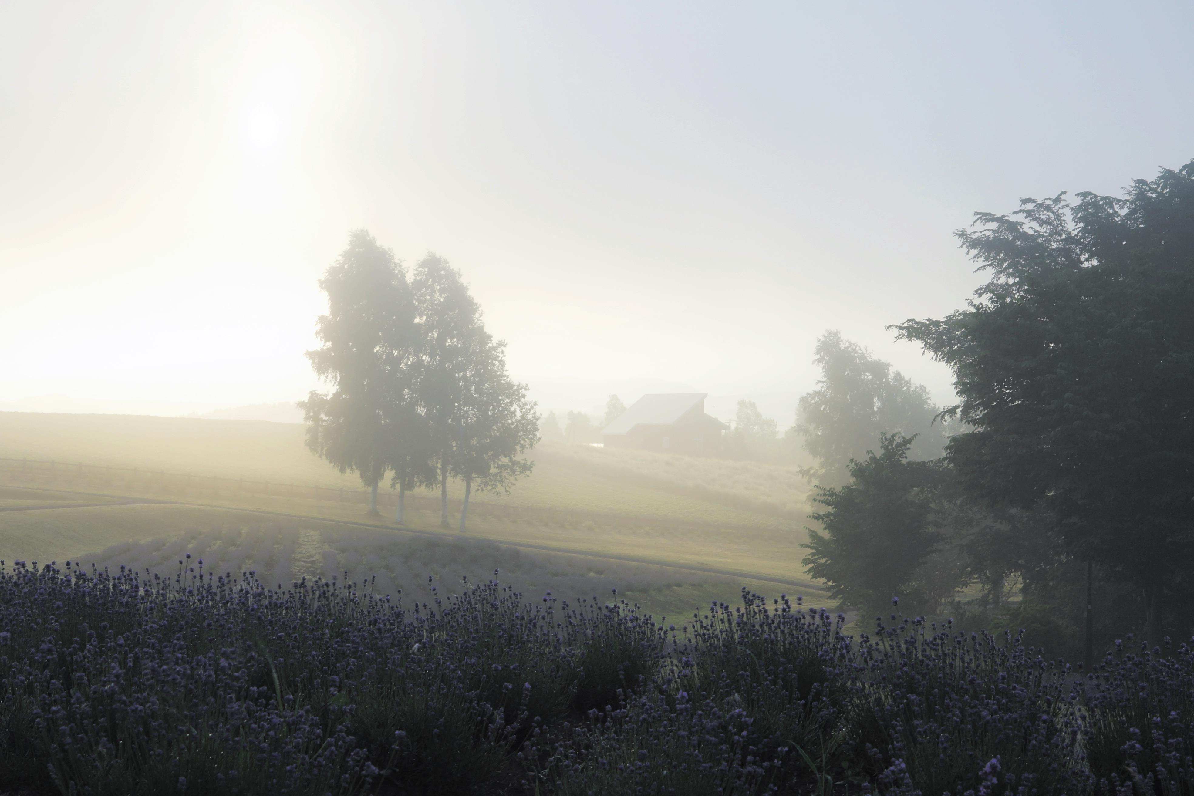 asia,japan,hokkaido,summer,morning,fog,lavender,purple,flower,house,rural,, Shin