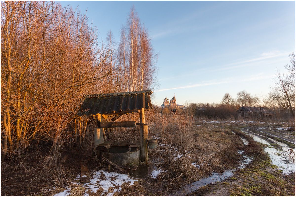 Старый колодец и весенняя распутица в деревне Березники. На заднем плане виден храмовый комплекс церквей Усекновения главы Иоанна Предтечи и Вознесения Господня в селе Парское.
