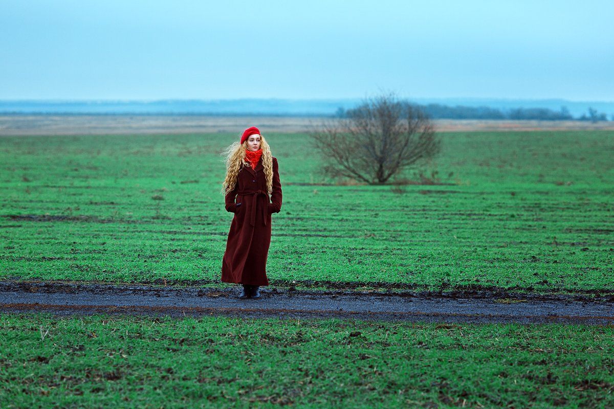 девушка, поле, осень, дорога, красный, зеленый, контраст, цвет, Марина Кондратова