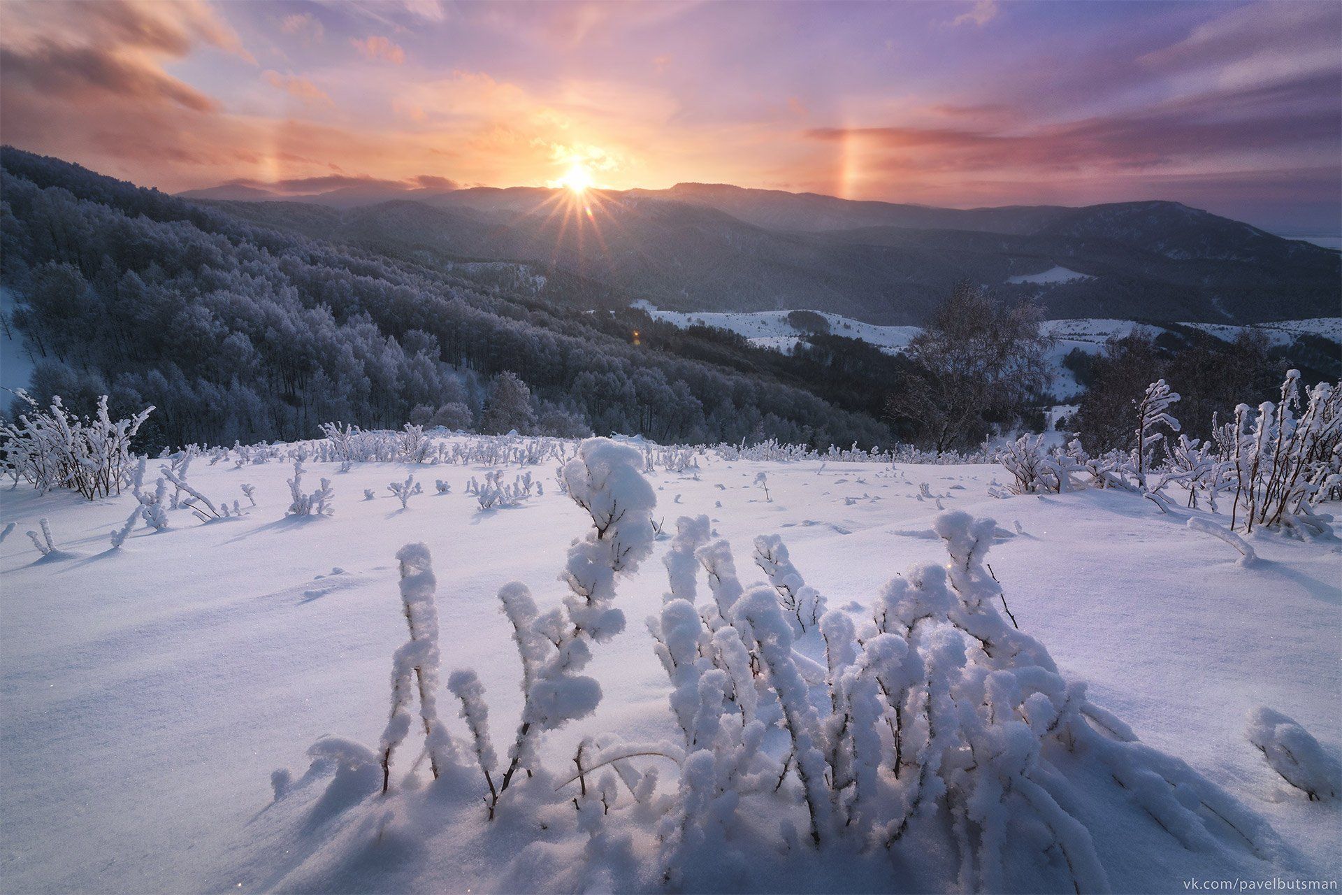 алтай, зима, закат, солнце, горы, снег, небо, лес, Павел Силиненко