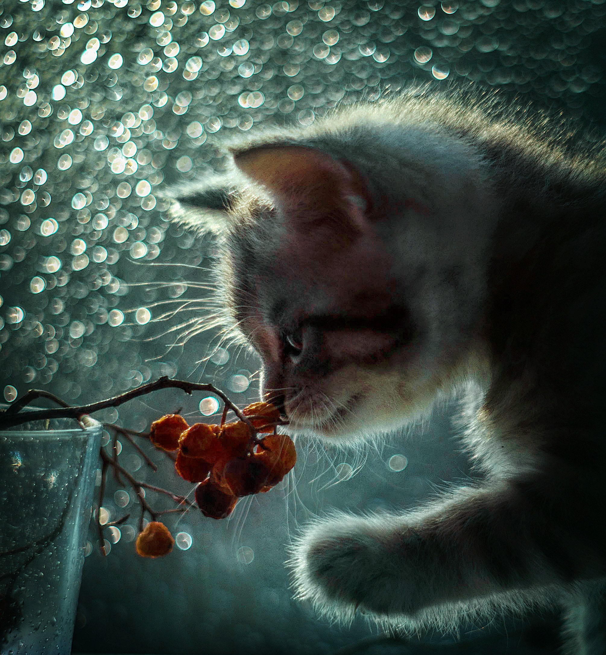 В тихом, сияющем свете, будто отражённом в каплях росы, котёнок с любопытством исследует ветку с ягодами. Его шерсть, мягкая и серебристая, словно окутана туманом, а взгляд — полон загадочного очарования. Это не просто сцена, а мгновение, где реальность сливается с фантазией, где каждый луч света рассказывает историю о тайнах ночи и чистоте детства.