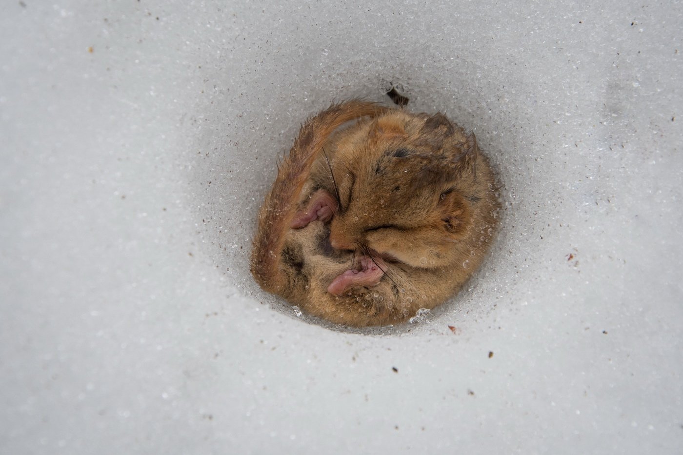 Орешниковая соня.Снег почти сошел,но она продолжает упорно спать,обычно раньше апреля сони не выходят из спячки.Эта ситуация губительна для животного,она сейчас абсолютно беззащитна перед любым хищником.