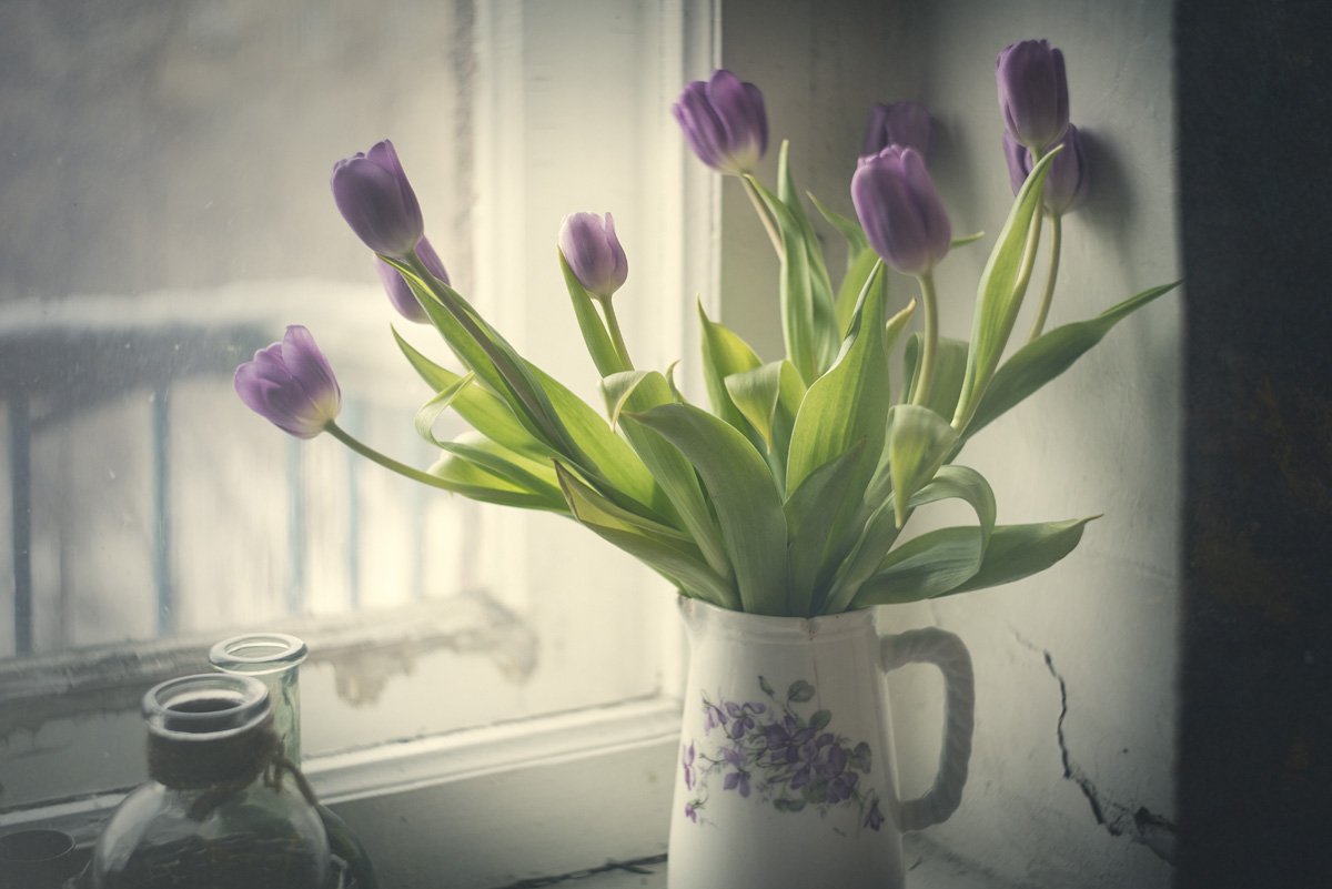 тюльпан, тюльпаны, цветы, ваза, окно, подоконник, весна, день, кувшин, фиолетовый, Игорь Токарев