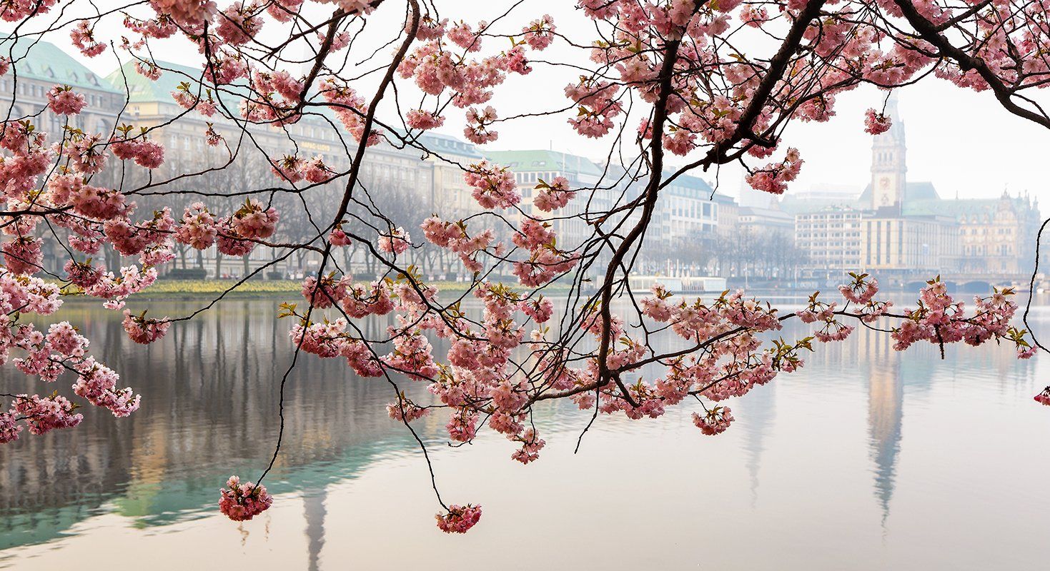 Это Гамбург, озеро Альстер, между веток видна башня Ратхауза. У нас давно всё цветёт, а сакура уже начала терять лепестки, вот успел снять, пока совсем не осыпалась.
