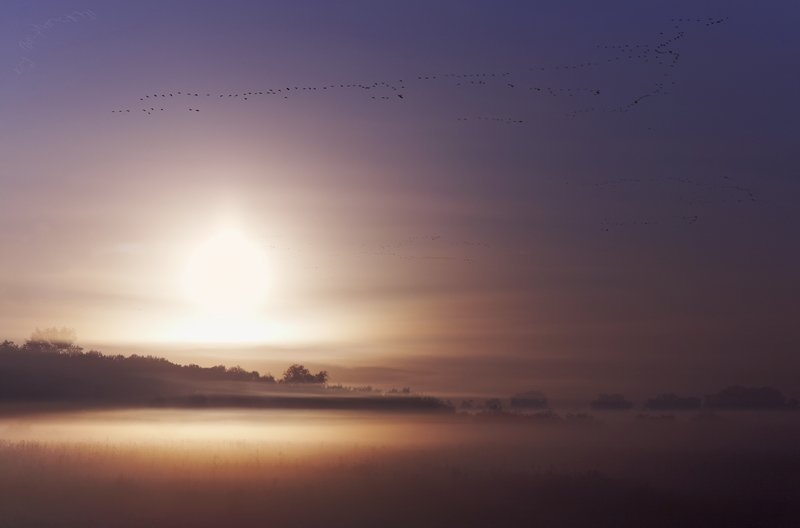 утро, рассвет, птицы, перелёт, туман, осень, Кирилл Брага