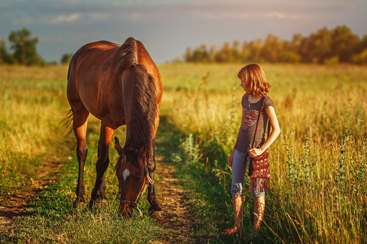 детство, дети, животные, лошадь, друзья, поле, лето, трава, закат, цветы полевые, наездница, выпас, сено, облака, красота, Марина Кондратова