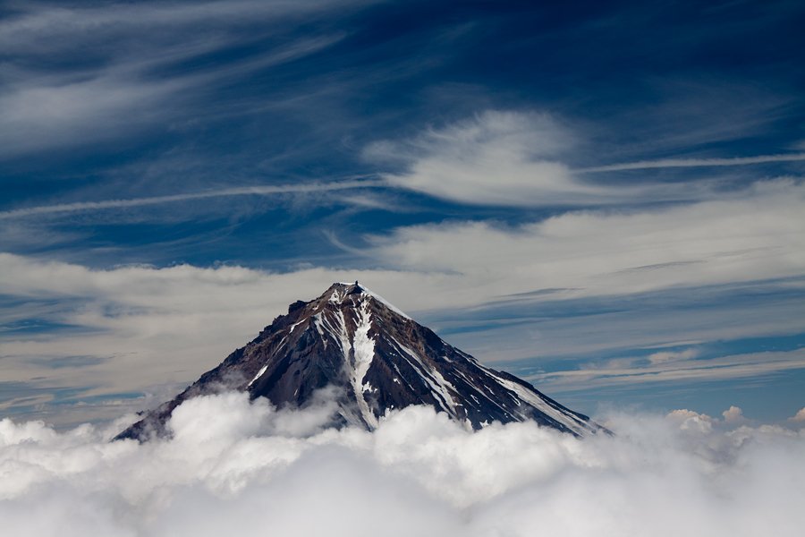 Камчатка. Первое восхождение на вулкан Авачинский этим летом сопровождалось отличной погодой. Вот так укутанный облаками в небе парил вулкан Корякский.