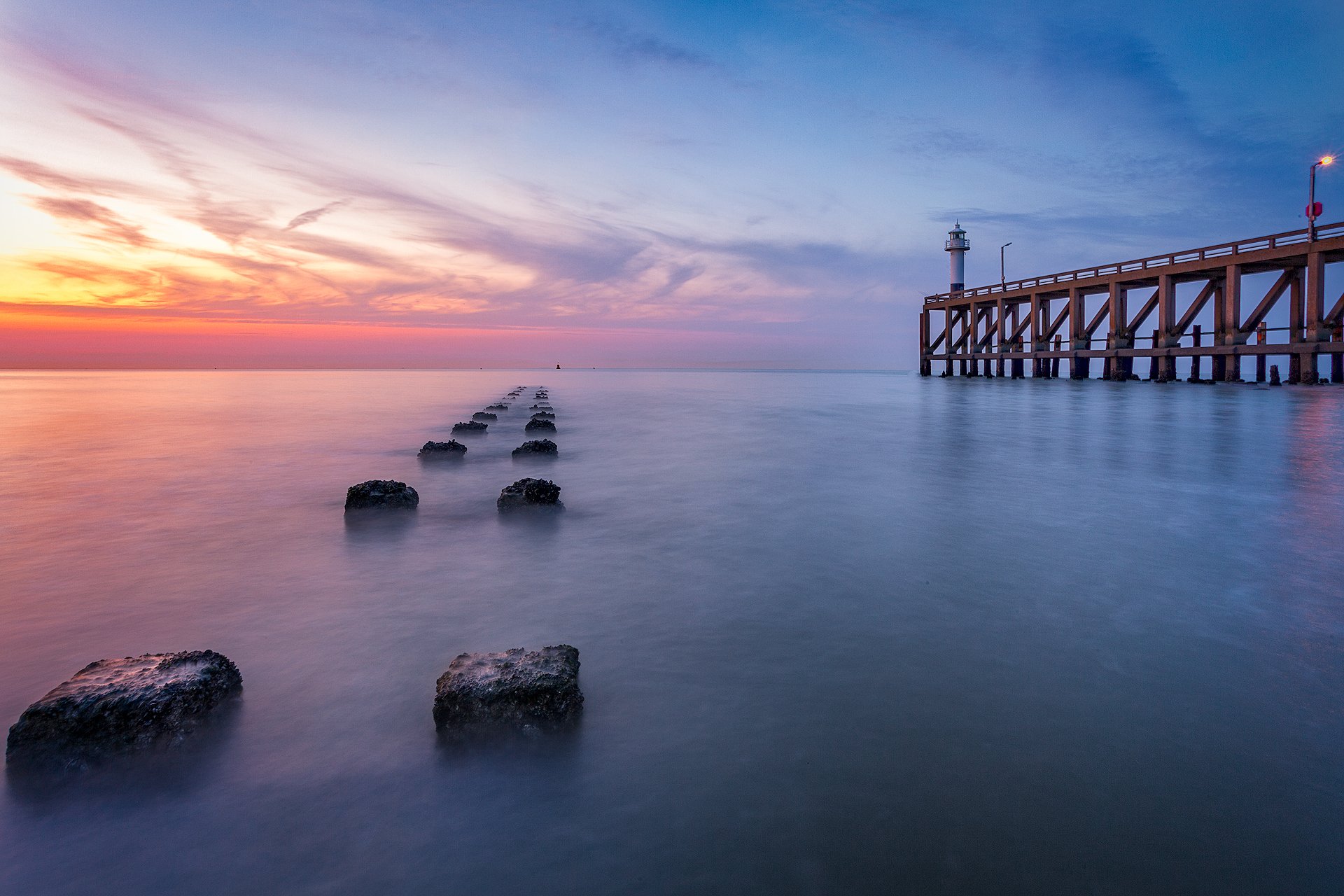 море, закат, маяк, небо, пирс,, Андрей Огнев