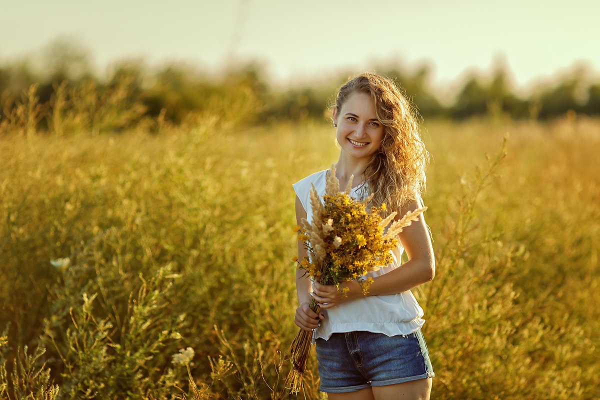 лето, теплый, рыжая деыушка, кудри, длинные волосы, поле, закат, цветы, трава, луг, природа, Марина Кондратова