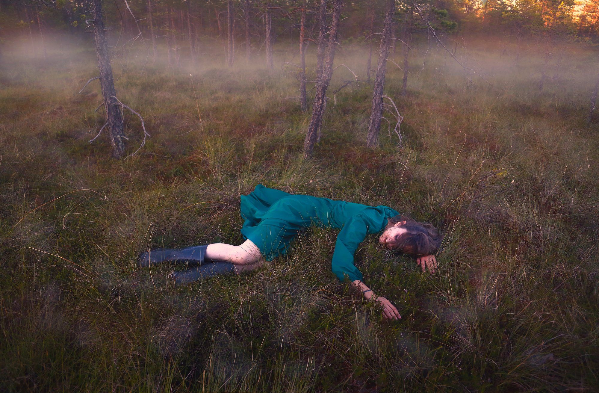 девушка, закат, лес, болото, трава, деревья, природа, туман, воздух, настроение, свет, цвет, портрет, жанр, жанровый портрет, Постонен Екатерина