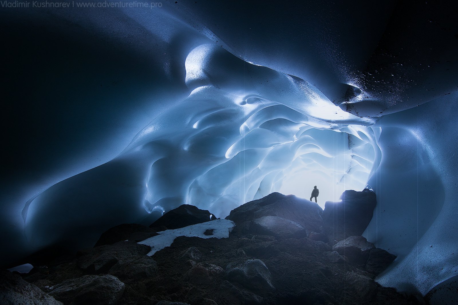 Каждый год, тающие снежники Мутновского вулкана образуют под собой причудливые пустоты-ледяные пещеры, разнообразные по форме, протяженности и размеру. Сочетание цвета, формы и погоды дает возможность увидеть и запечатлеть это явление. Иногда, совсем не похожее на реальность. Камчатка, Россия. adventuretime.pro