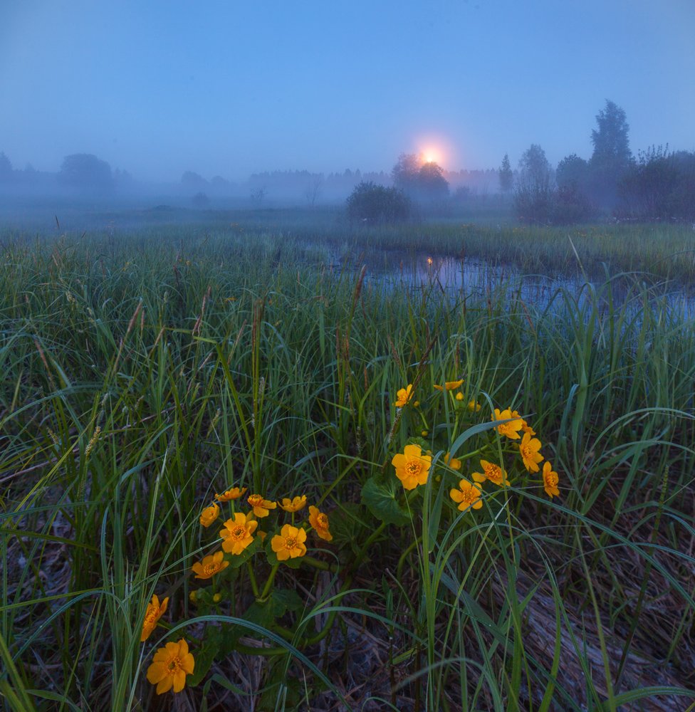 ленинградская область, ленобласть, болото, калужница, цветы, луна, ночь, лето, Арсений Кашкаров