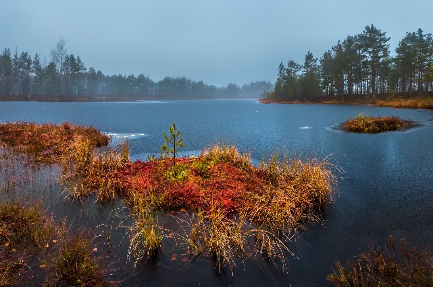 Был пасмурно-туманный рассвет. Морозно, первым ледком схватилась вода. Воздух и небо в стальной синеве. Зато болотный мох и трава, горели островками осенних красок. Это разноцветий вдохновляло на съёмку, несмотря на пасмурную погоду и пустое небо.