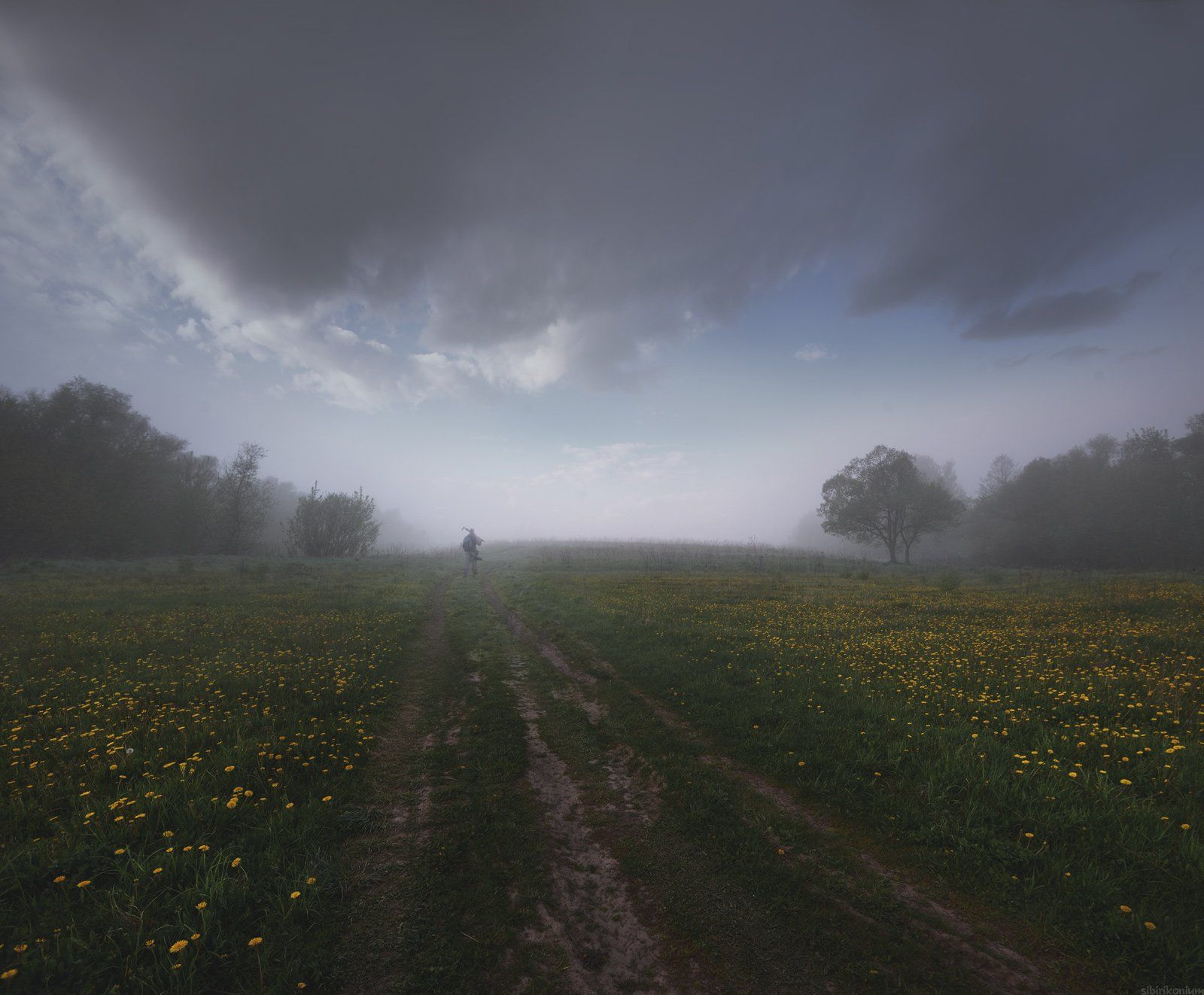 туман рассвет небо поле лес человек утро , Морозов Юрий