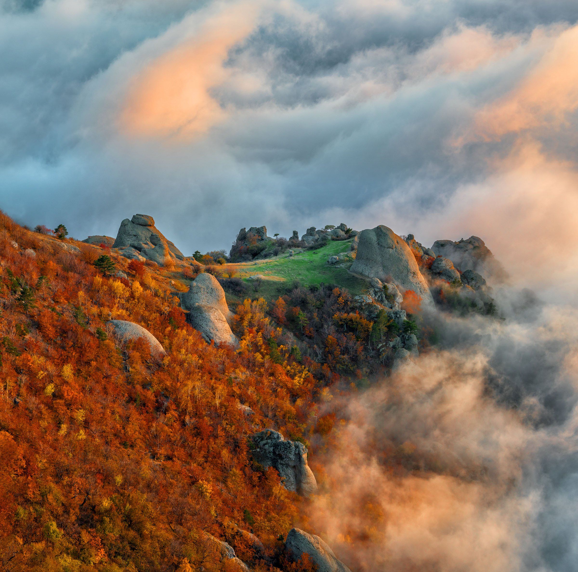 Морские туманы могут возникать по несколько раз в день, в отличии от туманов обычных. Морские туманы накатывают волнами и могут создавать волшебные картины в течении дня. Что и происходит в Крыму на Демерджи. В каком-то смысле с ними легче работать, чем с туманами, которые возникают по утрам в горах или на равнинах. Но оказывается морские туманы также очень капризны и бывают не каждый день. Мне повезло. Я жил на Демерджи с палаткой три дня и два дня были удивительнейшие туманы, они то накатывали, то волнились, то крутились вихрями, то отступали и опять наступали. Оставалось только дежурить и фотографировать. В какой-то момент туманы опустились ниже и зеленый мыс возник и белого крутящего марева на недолгое время, а потом опять утонул в пучине туманов.