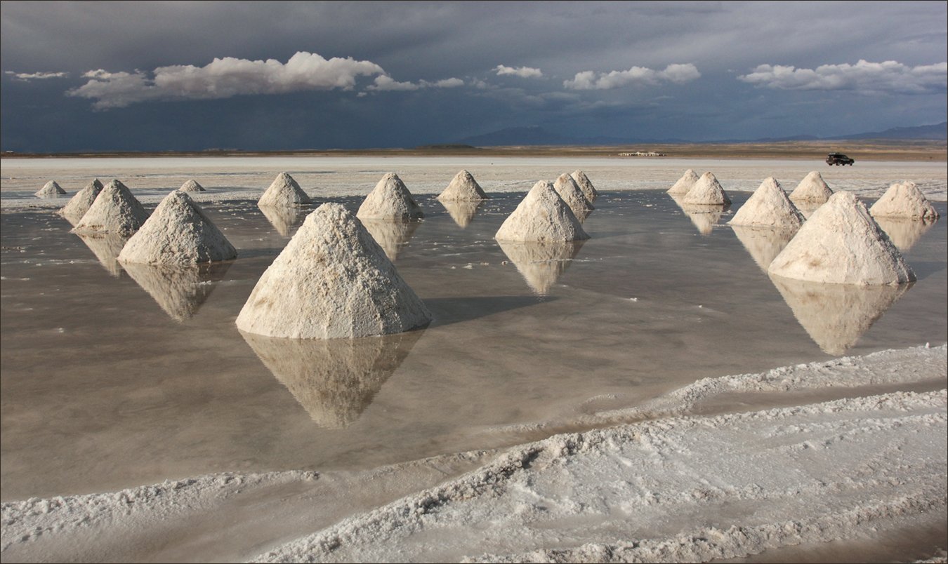 Солар-де-Уюни, Боливия - самое большое в мире соленое озеро площадью более 10 тысяч квадратных километров. Оно расположено на юге плато Альтиплано на высоте 3650 метров. Поверхность озера обладает высокой отражательной способностью: в сезон дождей оно становится абсолютно идеальным зеркалом. А эти пирамидки - соль. Кстати, она немного отличается от той, к которой мы привыкли, и очень вкусная :).